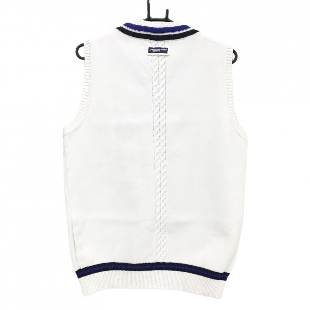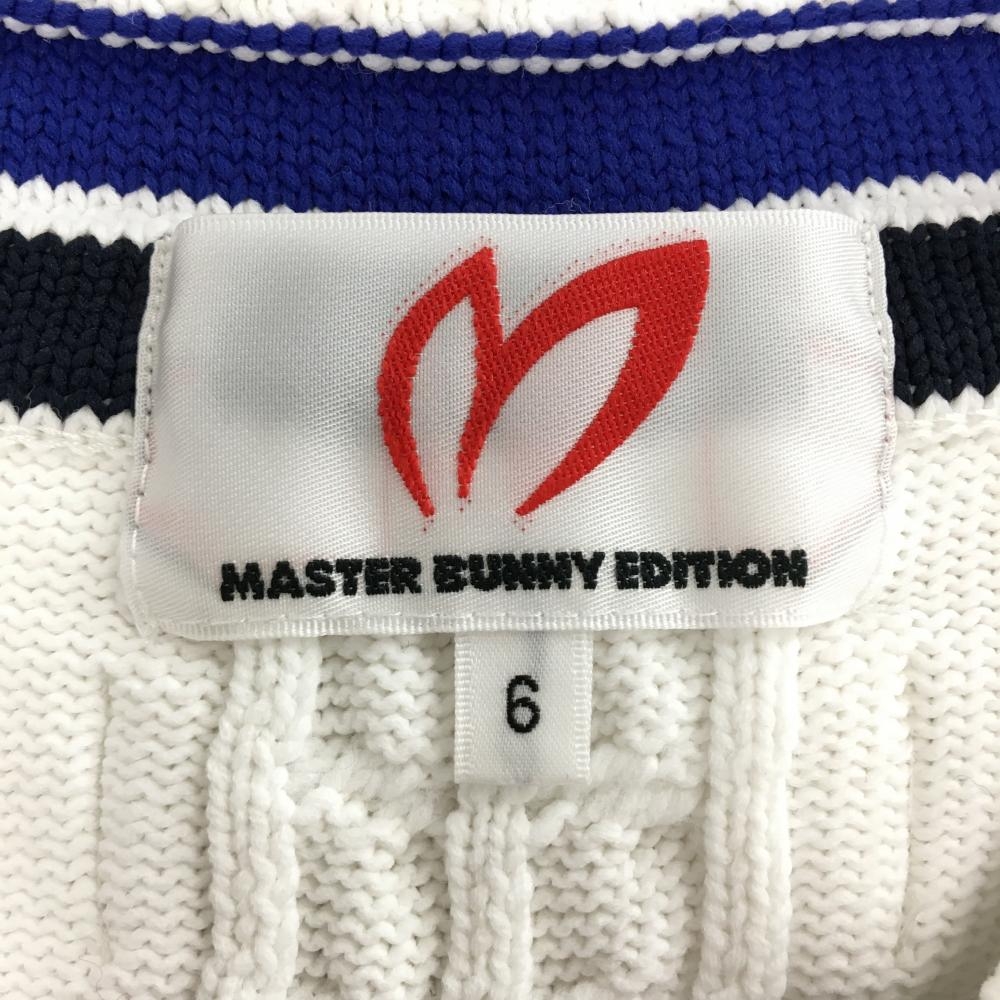 【美品】マスターバニー ニットベスト 白×ブルー 一部ケーブル編み Vネック メンズ 6(XL) ゴルフウェア MASTER BUNNY EDITION