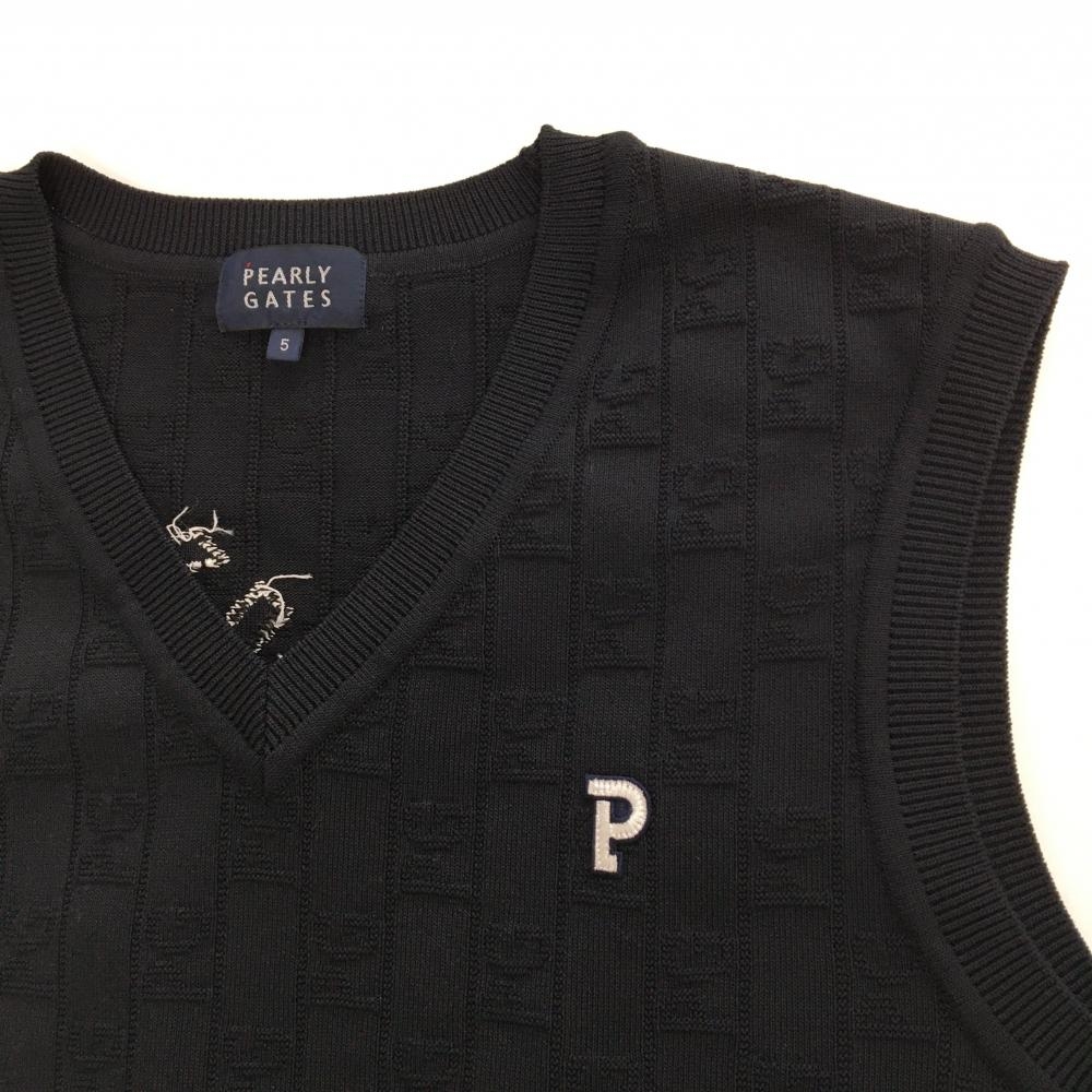 【超美品】パーリーゲイツ ニットベスト ダークネイビー 総柄 ロゴ白 Vネック メンズ 5(L) ゴルフウェア 2023年モデル PEARLY GATES