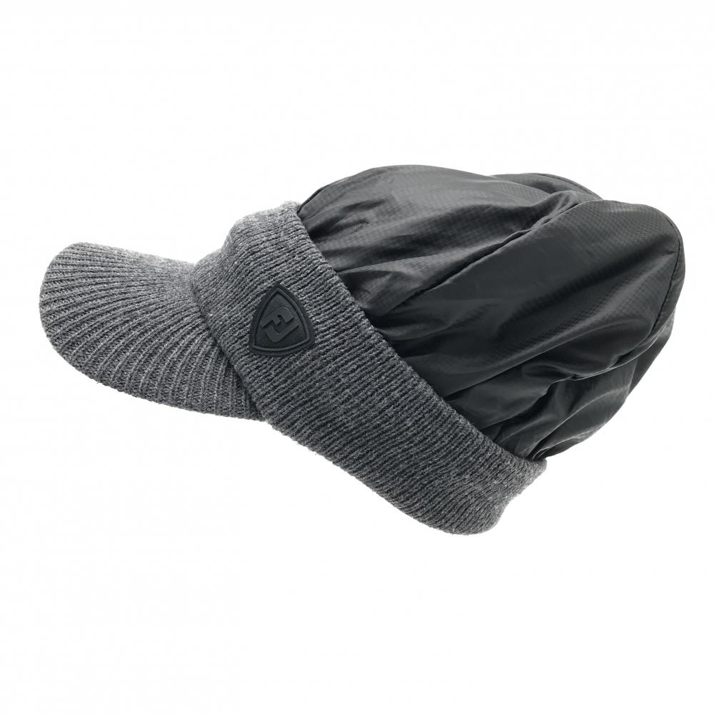 【美品】フットジョイ つば付き中綿ニット帽 杢ダークグレー×黒 一部千鳥格子地模様 ロゴ フリーサイズ(57-59cm) ゴルフウェア FootJoy