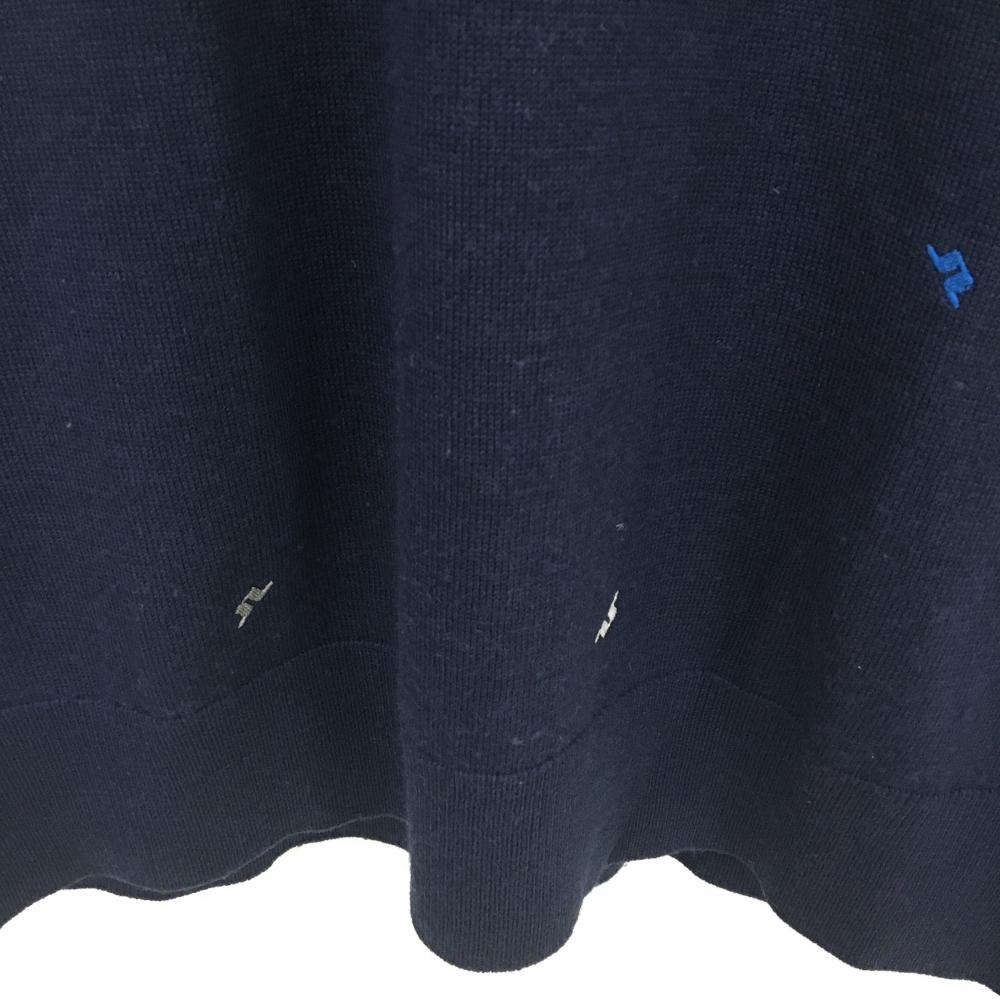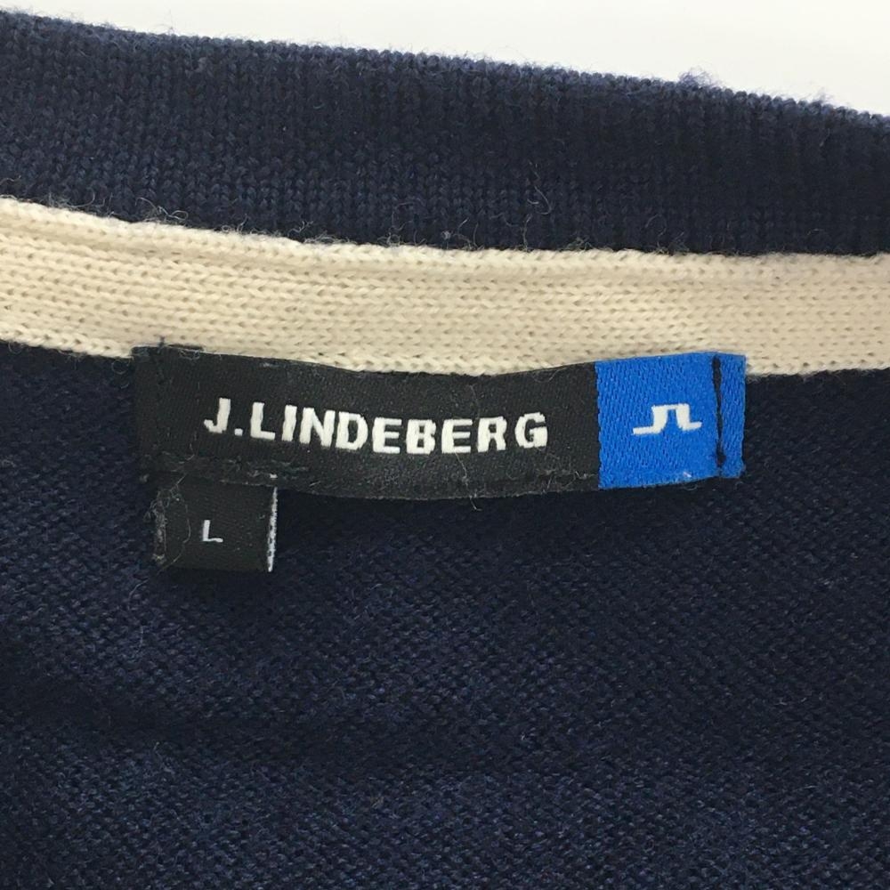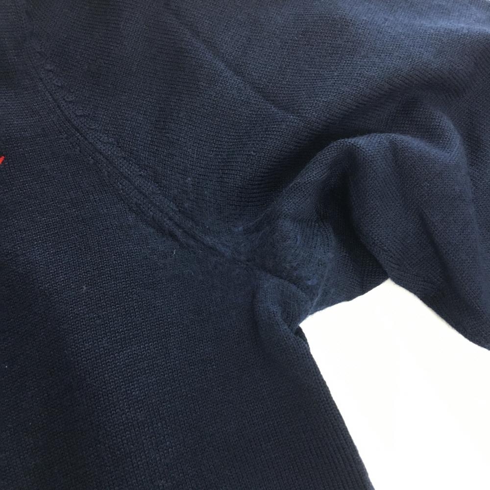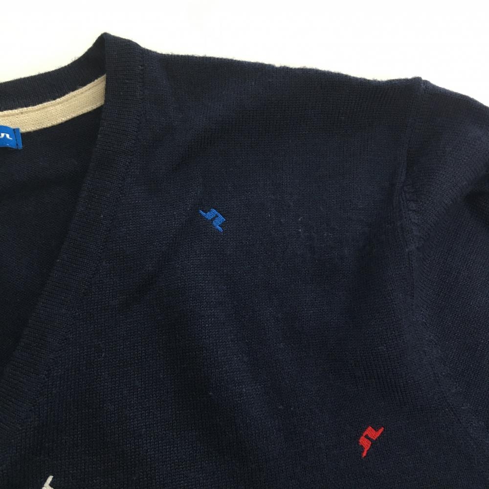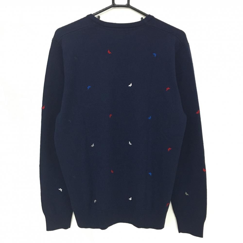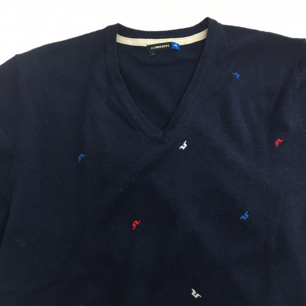 ジェイリンドバーグ セーター ネイビー×レッド ロゴ刺しゅう総柄 Vネック ニット ウール100% メンズ L ゴルフウェア J.LINDEBERG