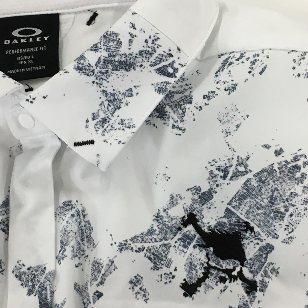 【超美品】オークリー 長袖シャツ 白×グレー 前総柄 ロゴ刺しゅう スナップボタン メンズ XL ゴルフウェア Oakley