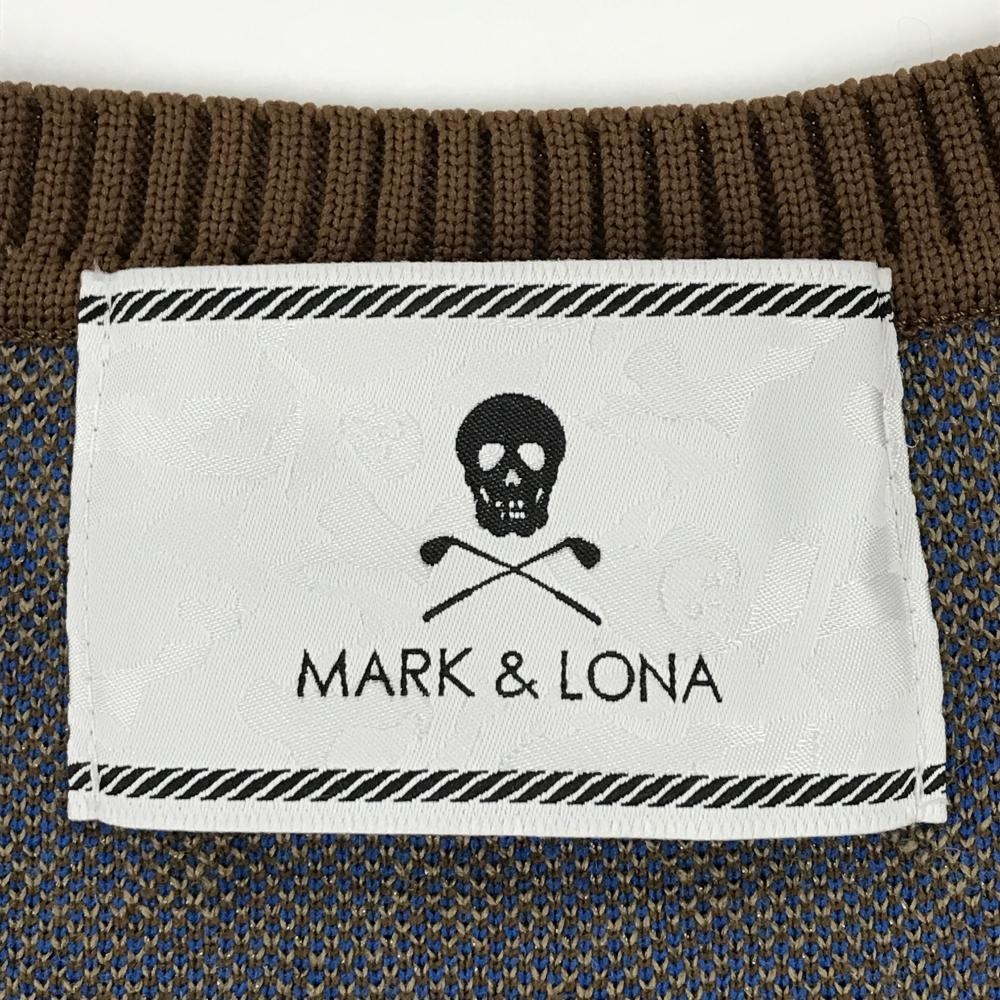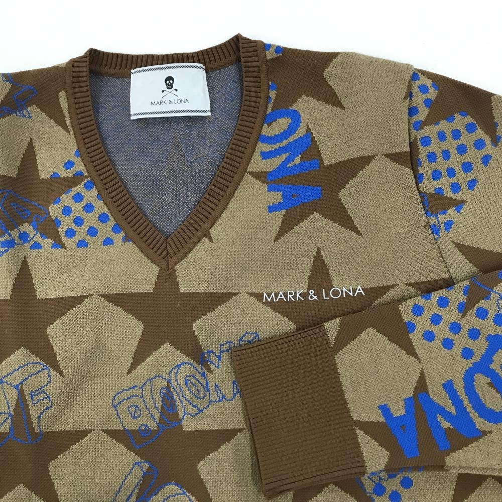 【超美品】マークアンドロナ セーター ブラウン×ブルー 総柄 Vネック セーター 星 メンズ 48(L) ゴルフウェア MARK&LONA