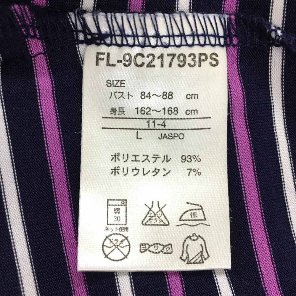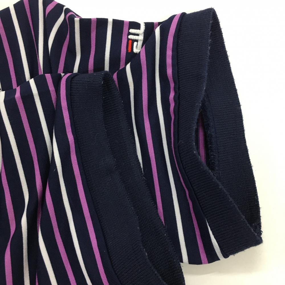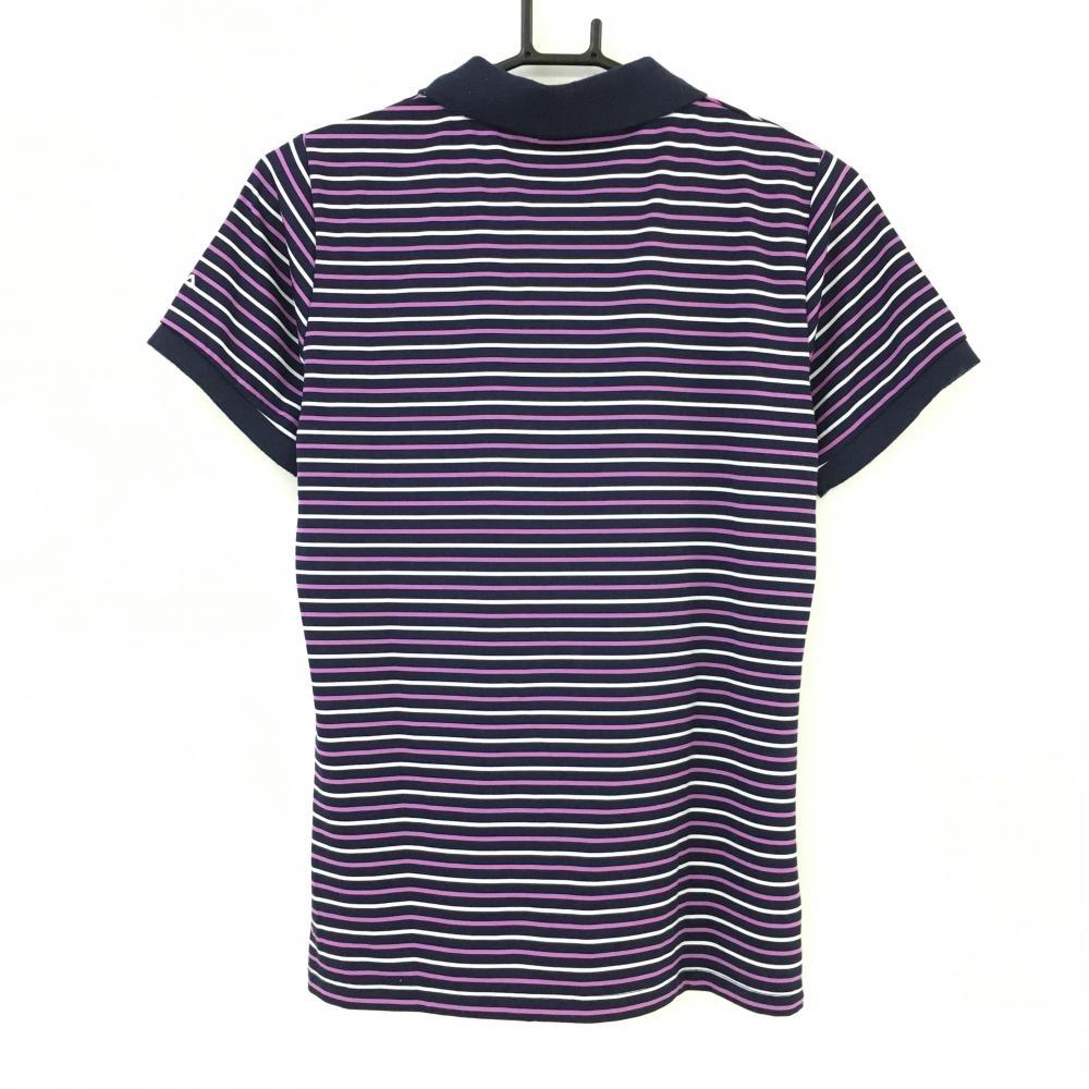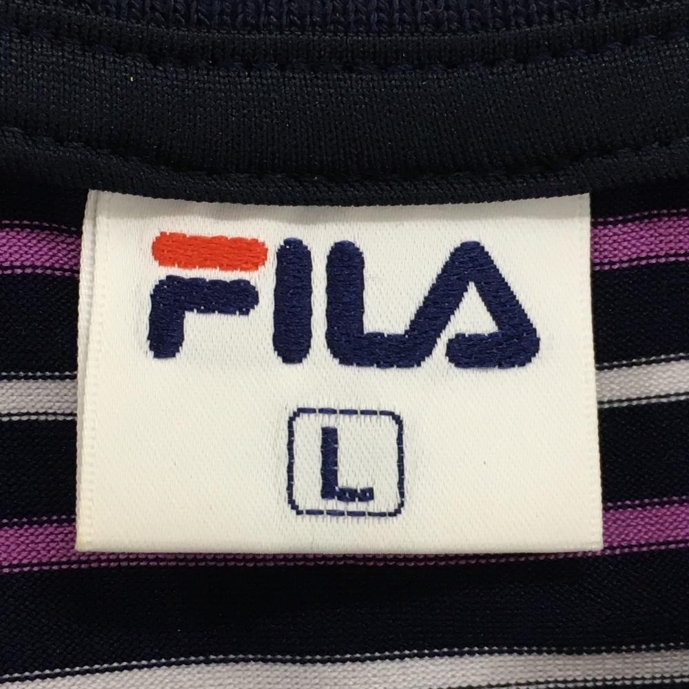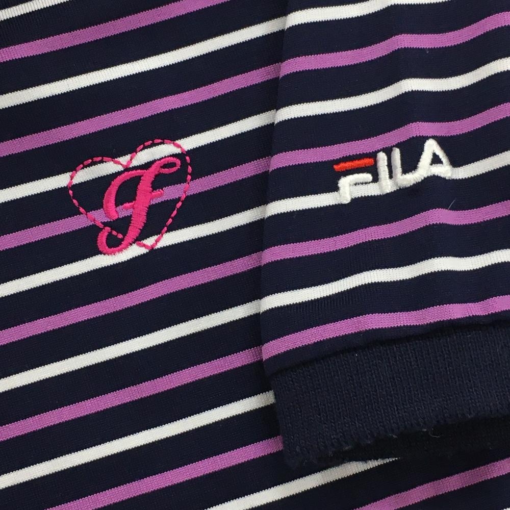【美品】フィラゴルフ 半袖ポロシャツ ネイビー×白 ボーダー 総柄 ストレッチ レディース L ゴルフウェア FILA GOLF