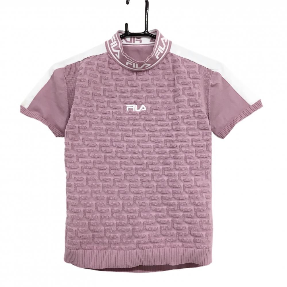 【美品】フィラゴルフ ハイネックセーター ライトブラウン ロゴ刺しゅう 背面ストライプ織 ニット メンズ M ゴルフウェア FILA GOLF