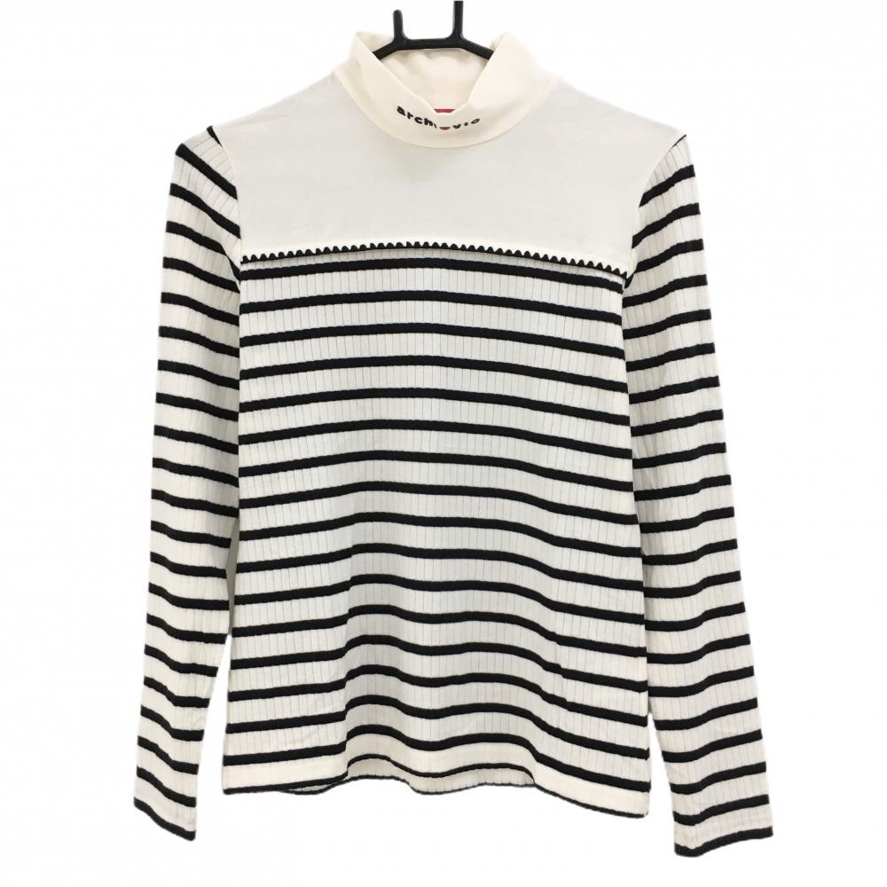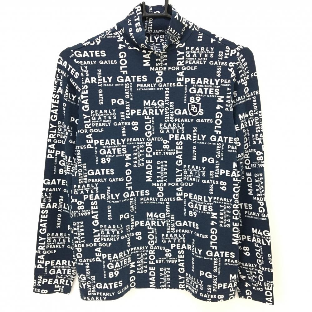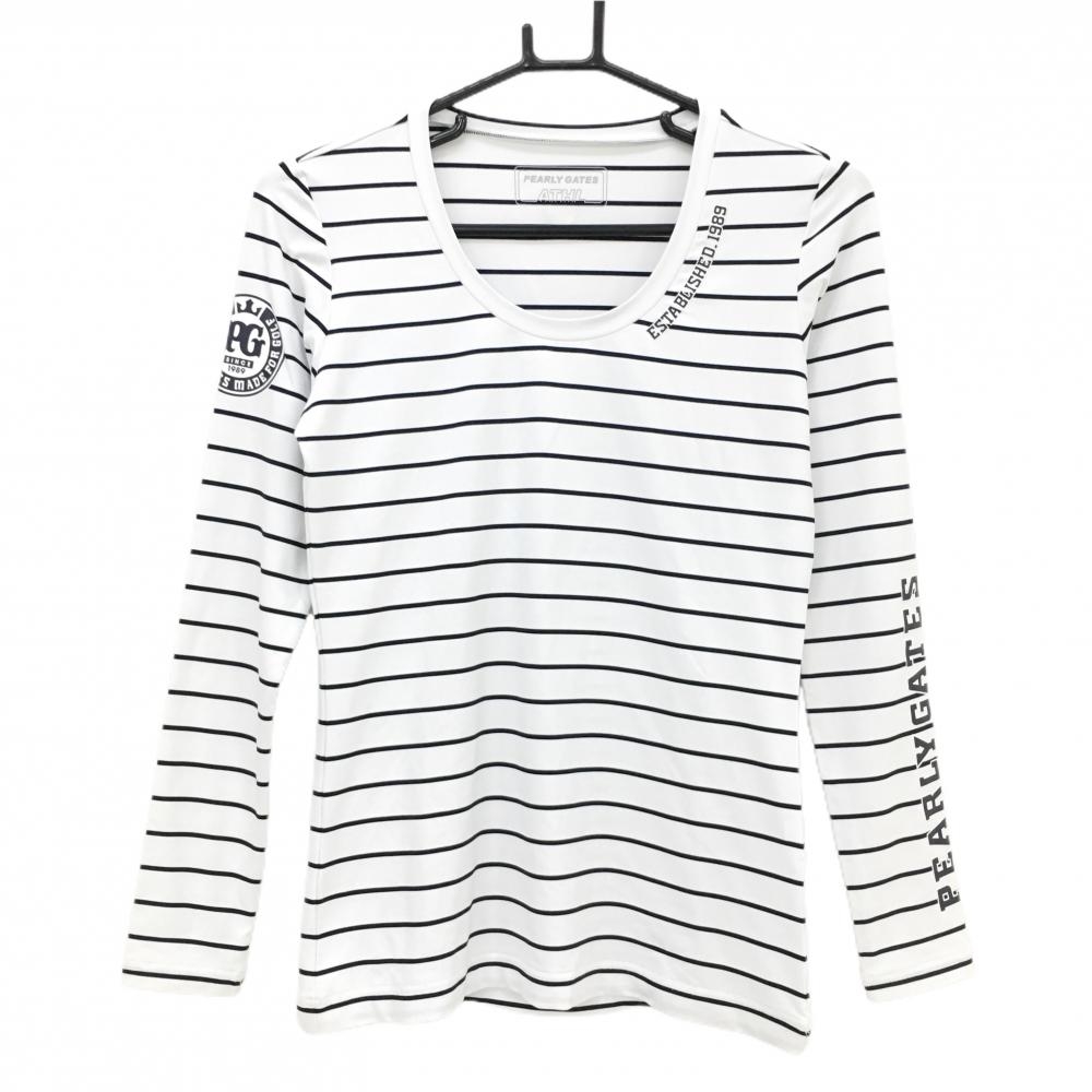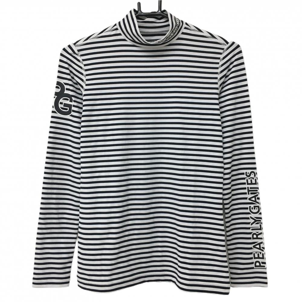 【美品】パーリーゲイツ 長袖ハイネックシャツ 白×ネイビー ボーダー ロゴプリント レディース 1(M) ゴルフウェア PEARLY GATES