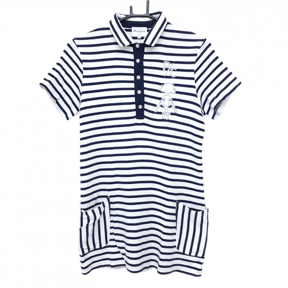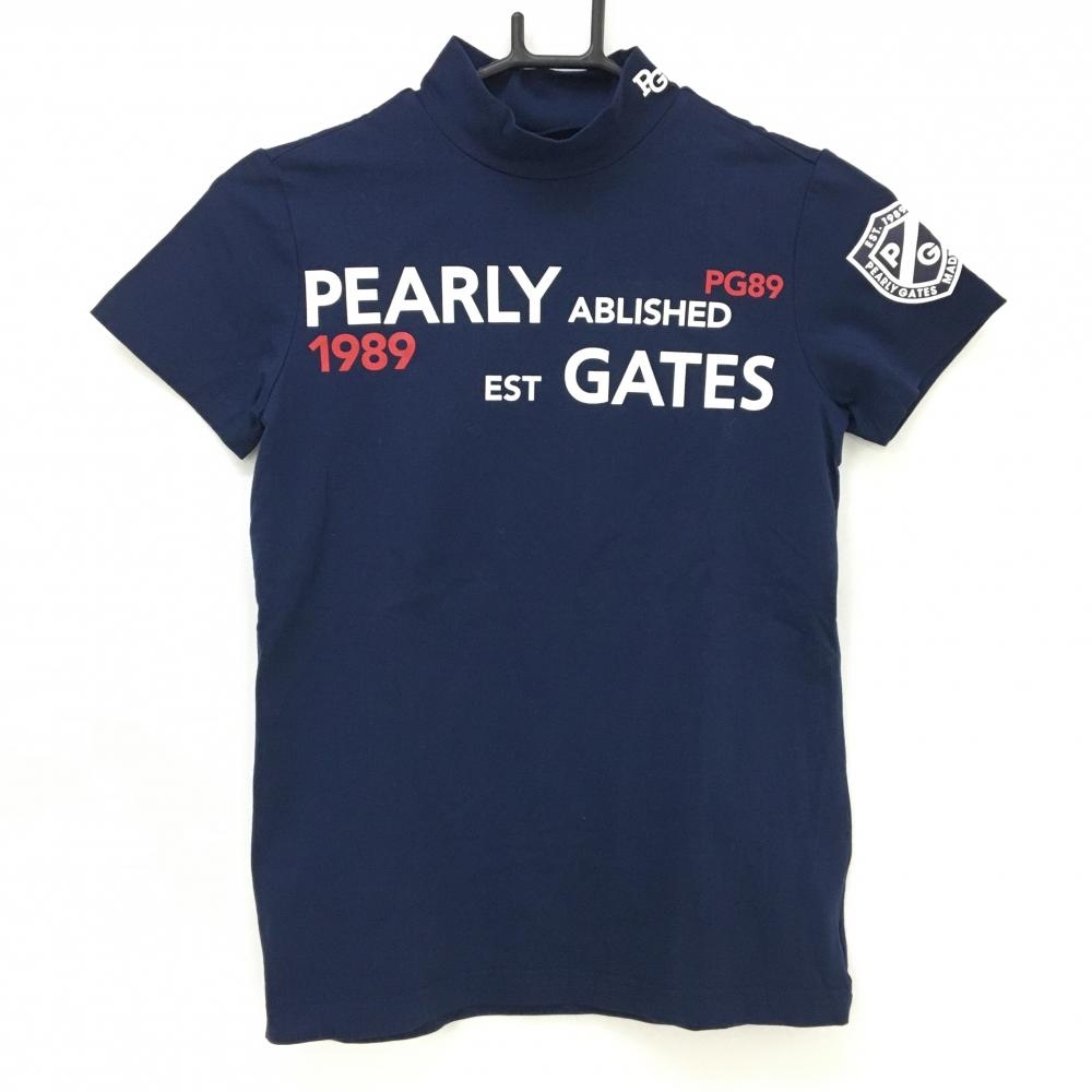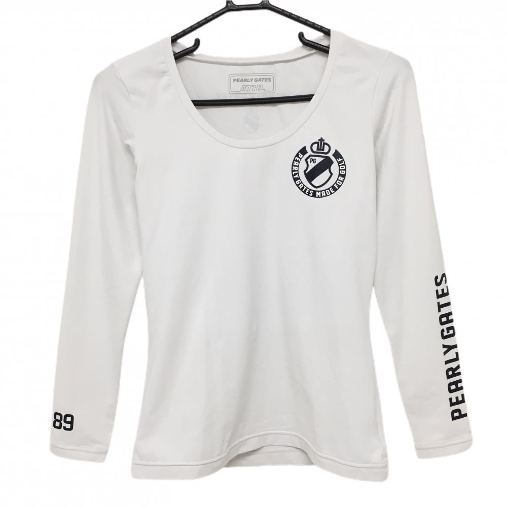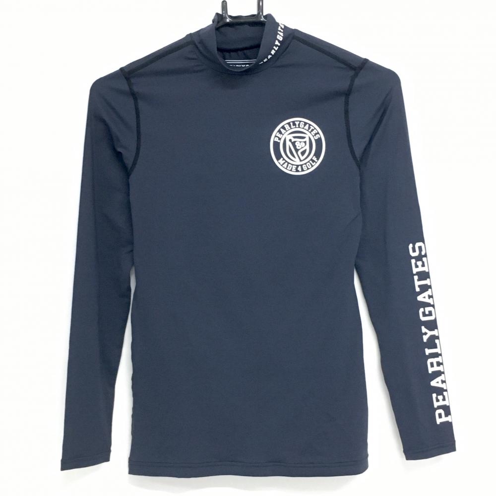 【美品】パーリーゲイツ 長袖ハイネックシャツ 白×ネイビー ボーダー ロゴプリント レディース 1(M) ゴルフウェア PEARLY GATES