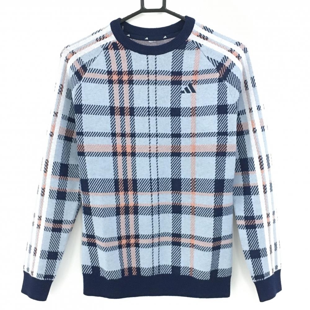 【美品】アディダス ニットベスト ライトブルー×ネイビー ケーブル編み 背面ストライプ Vネック レディース M/M ゴルフウェア adidas