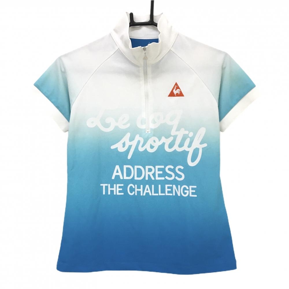 【美品】ルコックゴルフ ハイネックセーター 白×ブルー 一部柄 ハーフジップ ウール混 ニット メンズ L ゴルフウェア le coq sportif