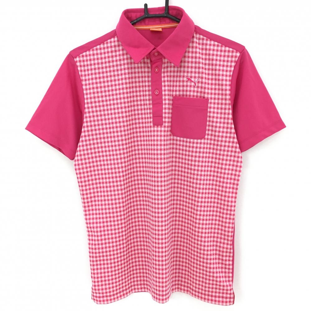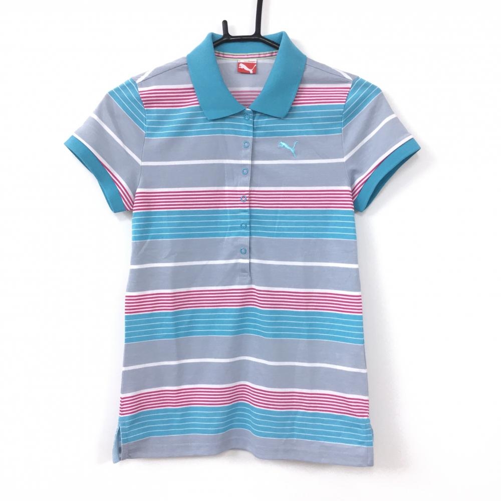 【美品】PUMA プーマ 半袖ポロシャツ ブルー×ピンク ボーダー柄 総柄 スナップボタン レディース S ゴルフウェア