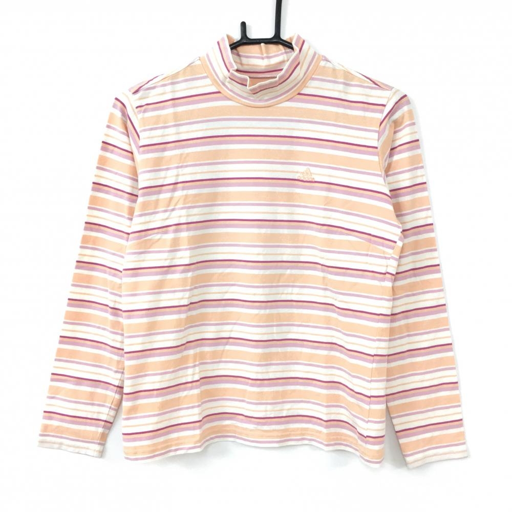 【超美品】adidas アディダス 長袖ハイネックシャツ ライトオレンジ×白 ボーダー ストレッチ レディース S/P ゴルフウェア