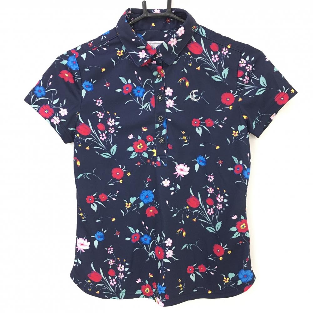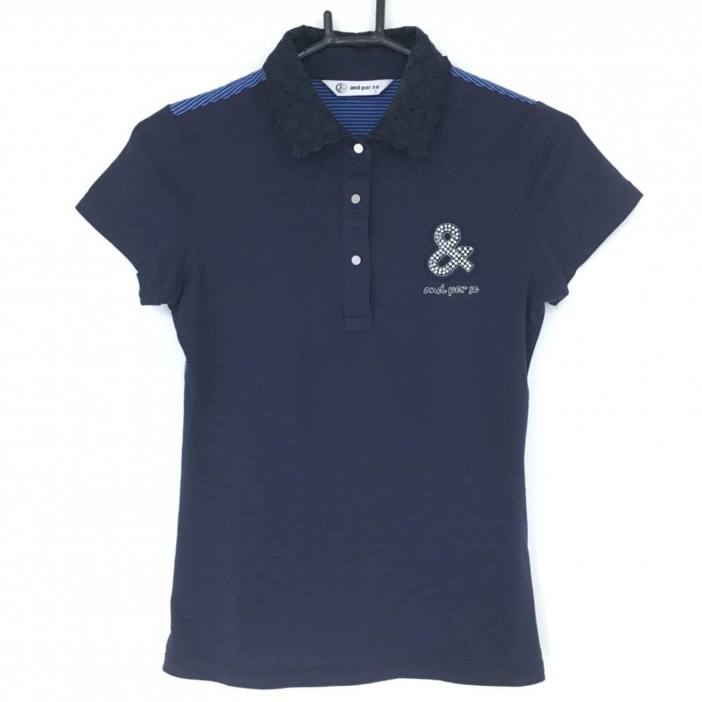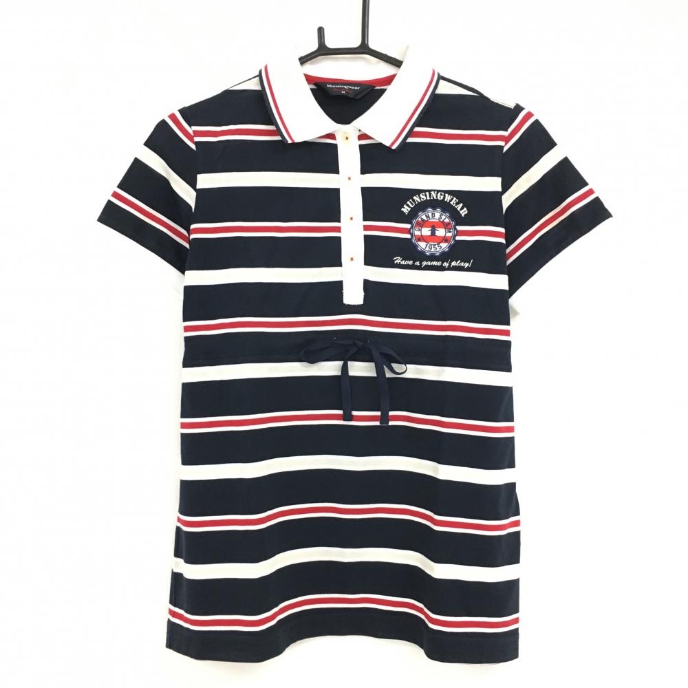 マンシングウェア 半袖ポロシャツ ネイビー×白×レッド ボーダー リボン付き レディース M ゴルフウェア Munsingwear