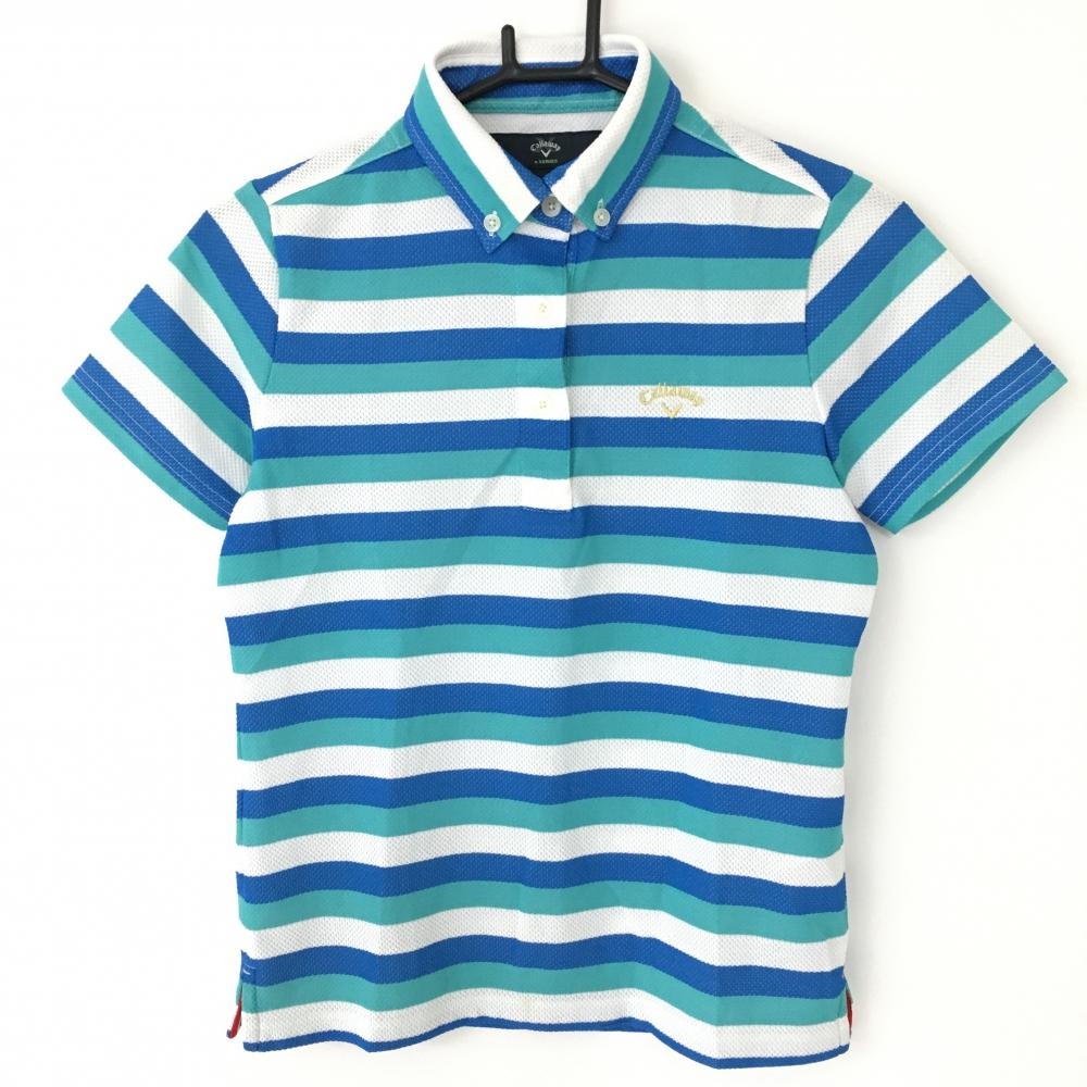 キャロウェイ XSERIES 半袖ポロシャツ 白×ブルー×グリーン ボーダー ボタンダウン レディース M ゴルフウェア Callaway