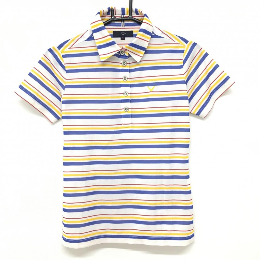 【美品】キャロウェイ 半袖ポロシャツ 白×イエロー ボーダー サンプル品 レディース M ゴルフウェア Callaway