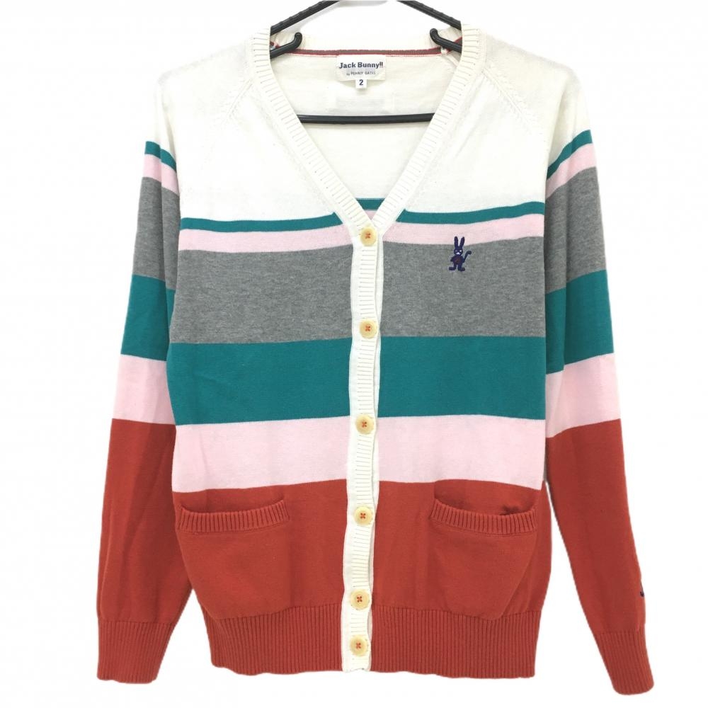 ジャックバニー カーディガン 白×マルチ ボーダー ロゴ刺しゅう レディース 2(L) ゴルフウェア Jack Bunny