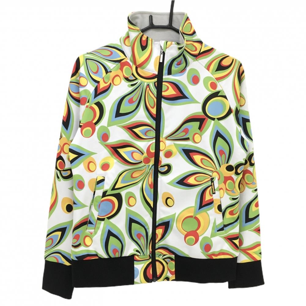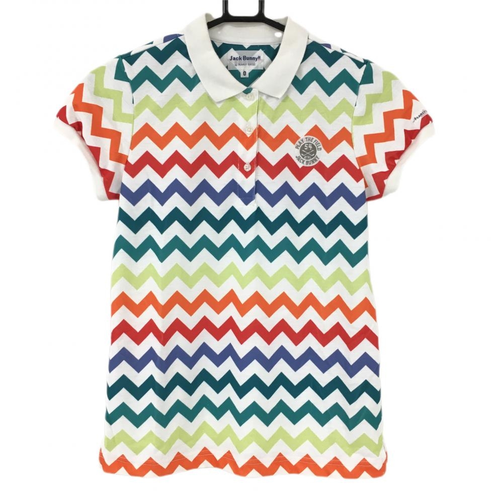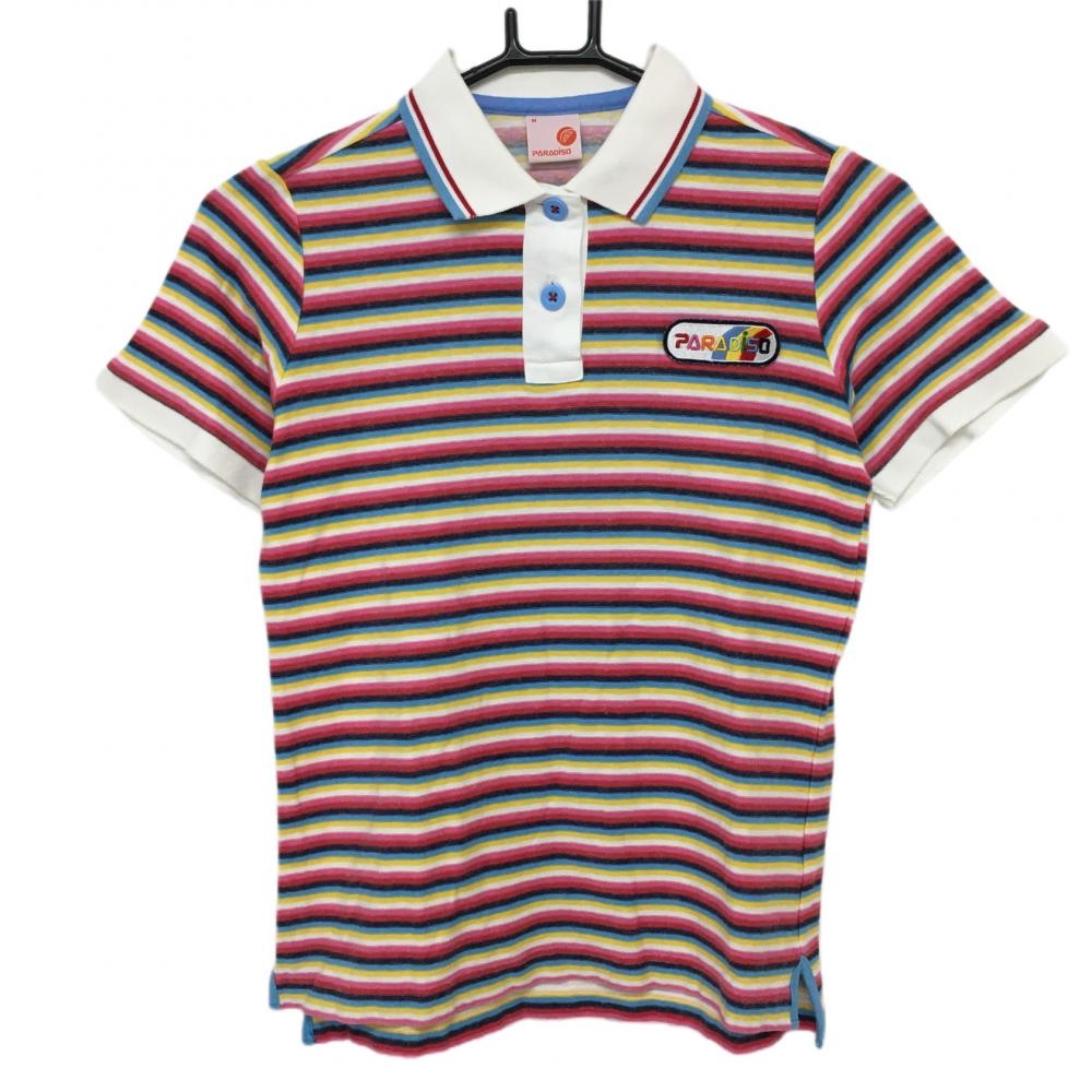 【美品】パラディーゾ 半袖ポロシャツ 白×マルチカラー ボーダー 総柄 レディース M ゴルフウェア Paradiso