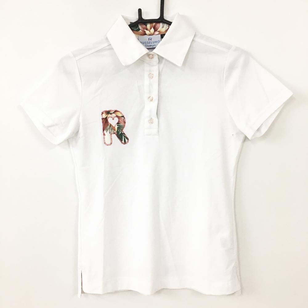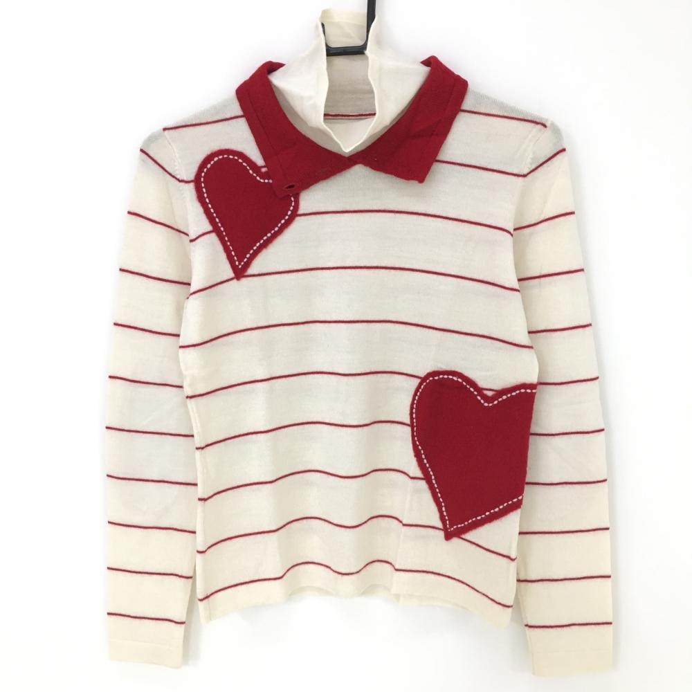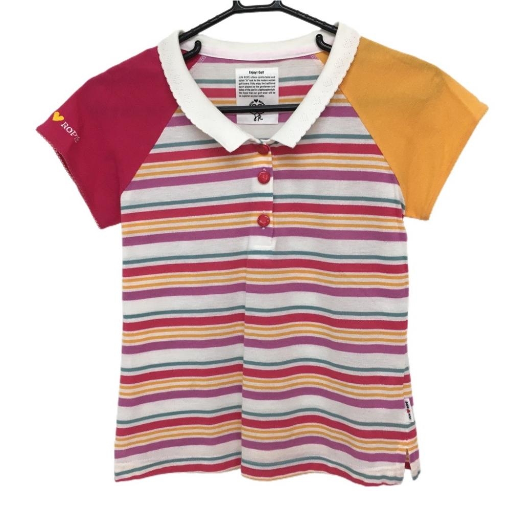 ジュンアンドロペ 半袖ポロシャツ 白×マルチ ボーダー 袖口ピコレース 襟ハート透かし編み レディース M ゴルフウェア JUN&ROPE
