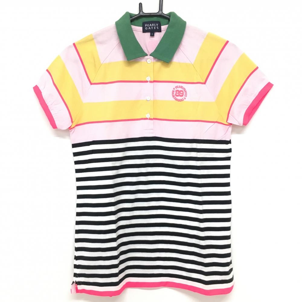 【美品】パーリーゲイツ 半袖ポロシャツ 蛍光ピンク×イエロー ボーダー 黒×白 コットン混 レディース 1(M) ゴルフウェア PEARLY GATES