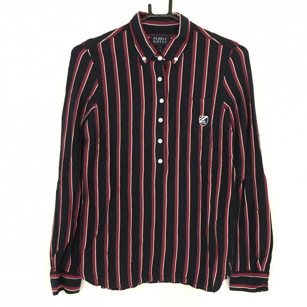 【美品】パーリーゲイツ 長袖ポロシャツ ダークネイビー×ボルドー ストライプ ボタンダウン レディース 1(M) ゴルフウェア PEARLY GATES