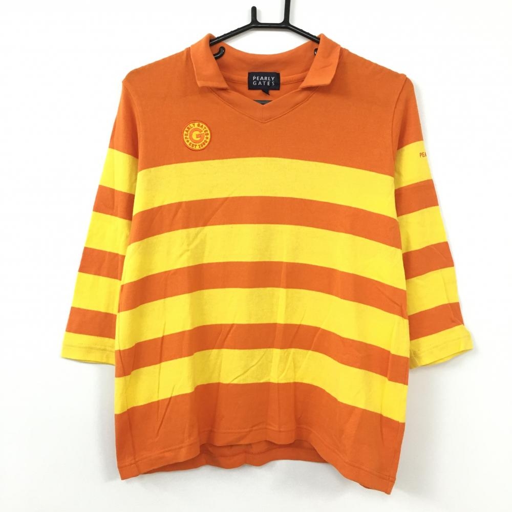 【美品】パーリーゲイツ 襟付き長袖シャツ オレンジ×イエロー ボーダー柄 七分丈 レディース 1(M) ゴルフウェア PEARLY GATES