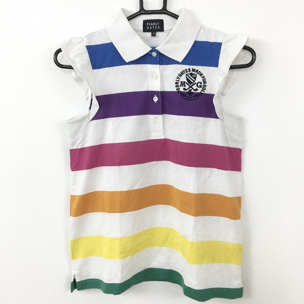 パーリーゲイツ ノースリーブポロシャツ 白×マルチ カラフルボーダー 袖フリル レディース 0(S) ゴルフウェア PEARLY GATES