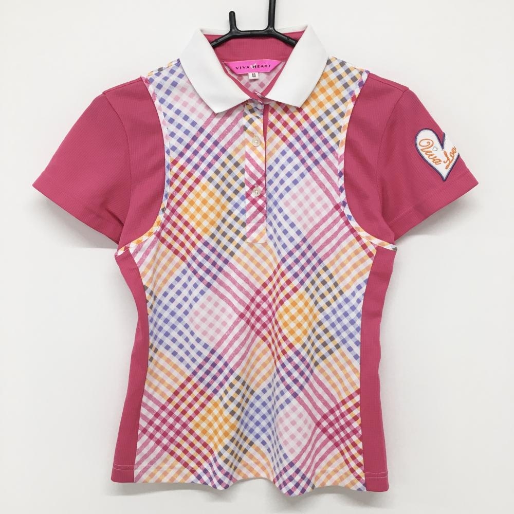 ビバハート 半袖ポロシャツ ピンク チェックマルチ レディース 40 ゴルフウェア 襟汚れ VIVA HEART
