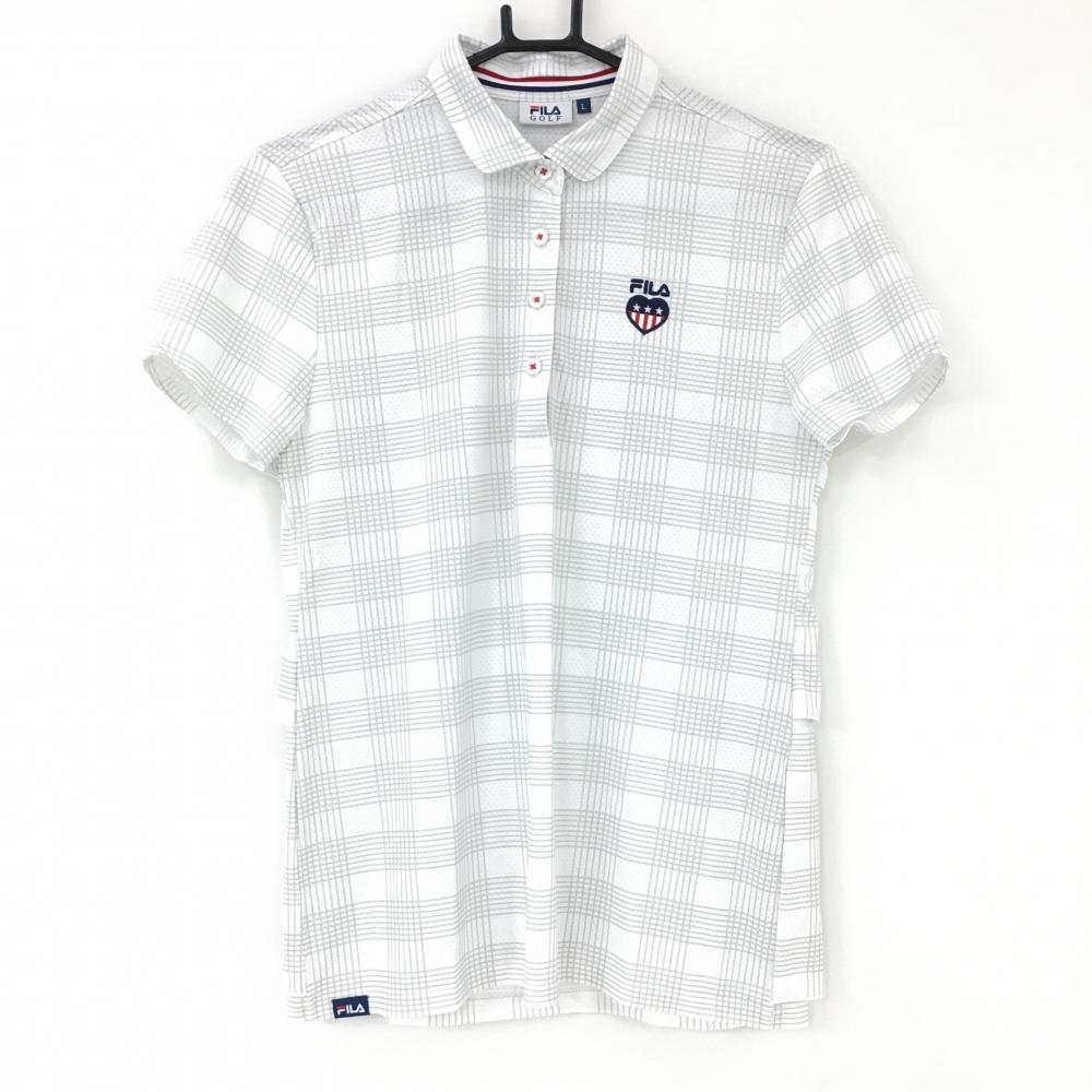 【超美品】フィラゴルフ 半袖ポロシャツ 白×グレー チェック柄 背面3段フリル レディース L ゴルフウェア FILA GOLF