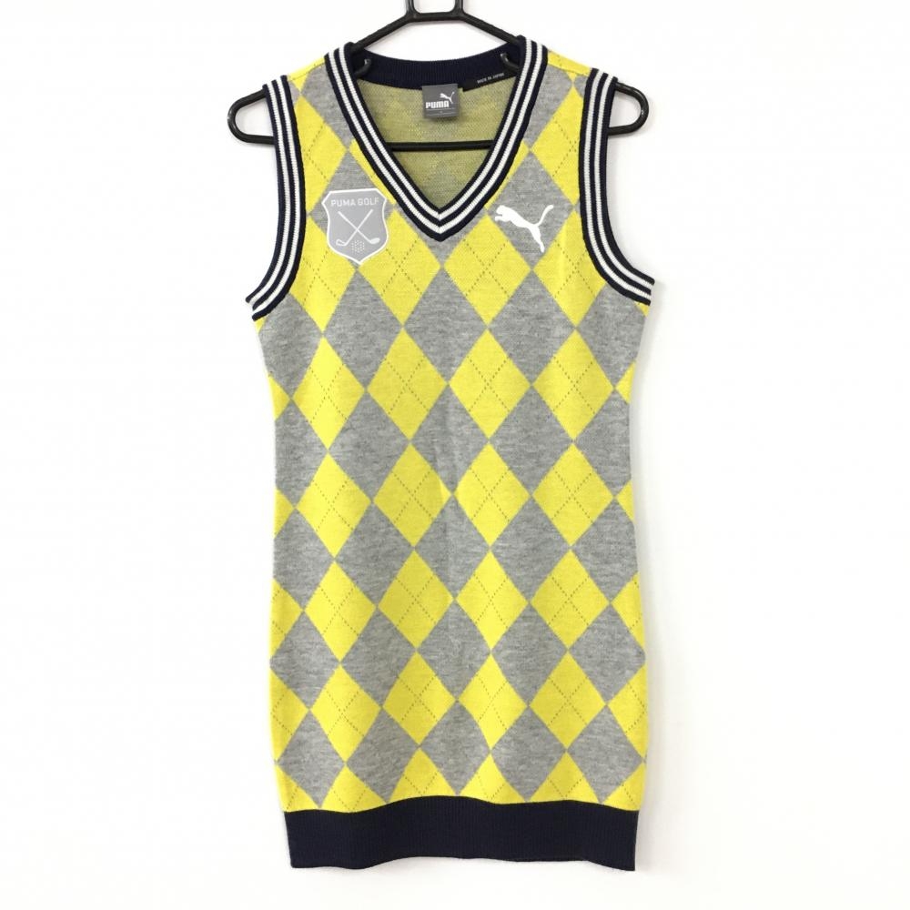 【超美品】プーマゴルフ ノースリーブニットワンピース イエロー×グレー アーガイル柄 ウール混 日本製 レディース S ゴルフウェア PUMA