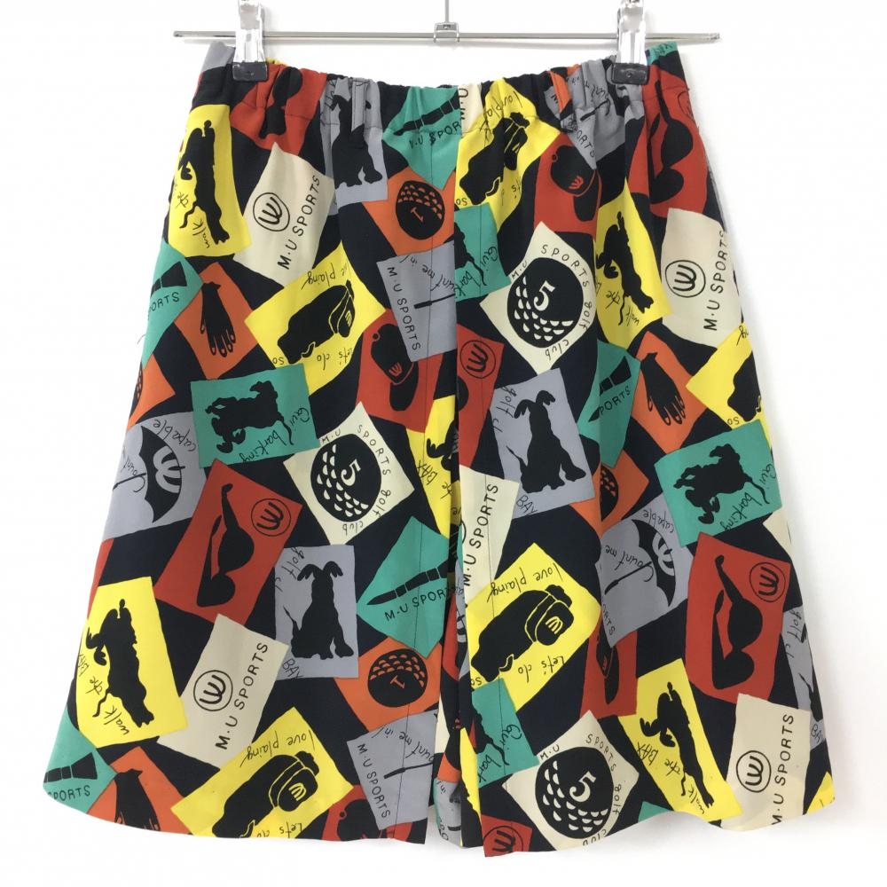 【美品】M・U SPORTS MUスポーツ キュロットスカート 黒×マルチ キャディバッグ×ドッグ総柄 ウエストゴム レディース 40 ゴルフウェア