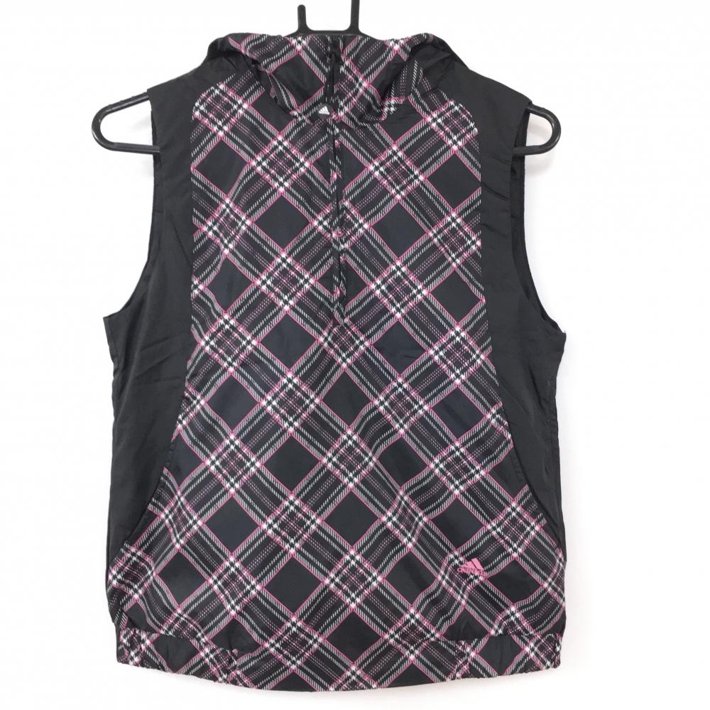 【超美品】adidas アディダス 中綿ベスト 黒×ピンク 前面チェック フード付き 3ライン レディース S/P ゴルフウェア