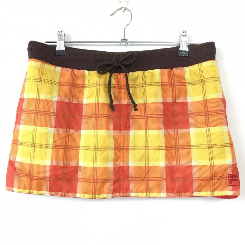 【美品】フィラゴルフ 中綿リバーシブルスカート オレンジ×イエロー×レッド チェック×ハート 総柄 レディース L ゴルフウェア FILA GOLF