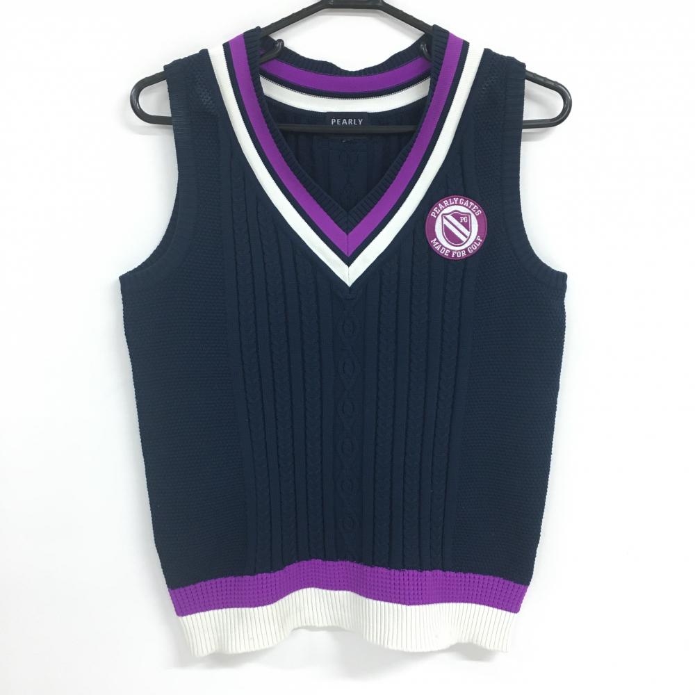 【超美品】パーリーゲイツ ニットベスト ネイビー×パープル ケーブル編み Vネック レディース 0(S) ゴルフウェア PEARLY GATES