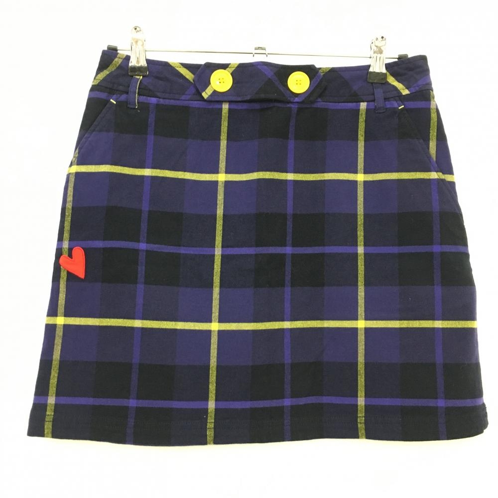 【美品】ヒールクリーク ボアスカート ダークネイビー×パープル チェック風 フロントジップ レディース 42(L) ゴルフウェア Heal Creek
