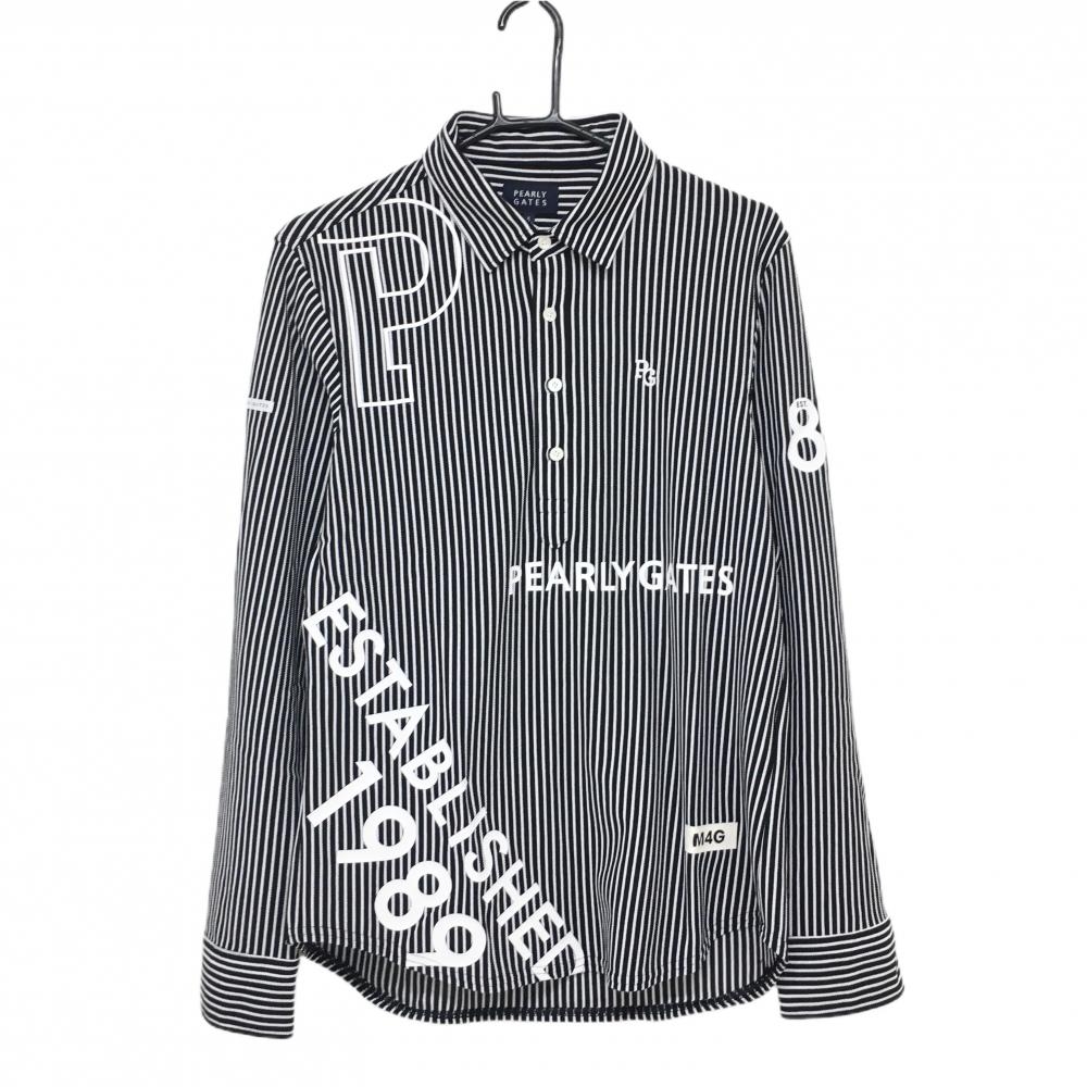 【美品】パーリーゲイツ 長袖ポロシャツ ネイビー×白 ストライプ ボタンダウン レディース 0(S) ゴルフウェア PEARLY GATES