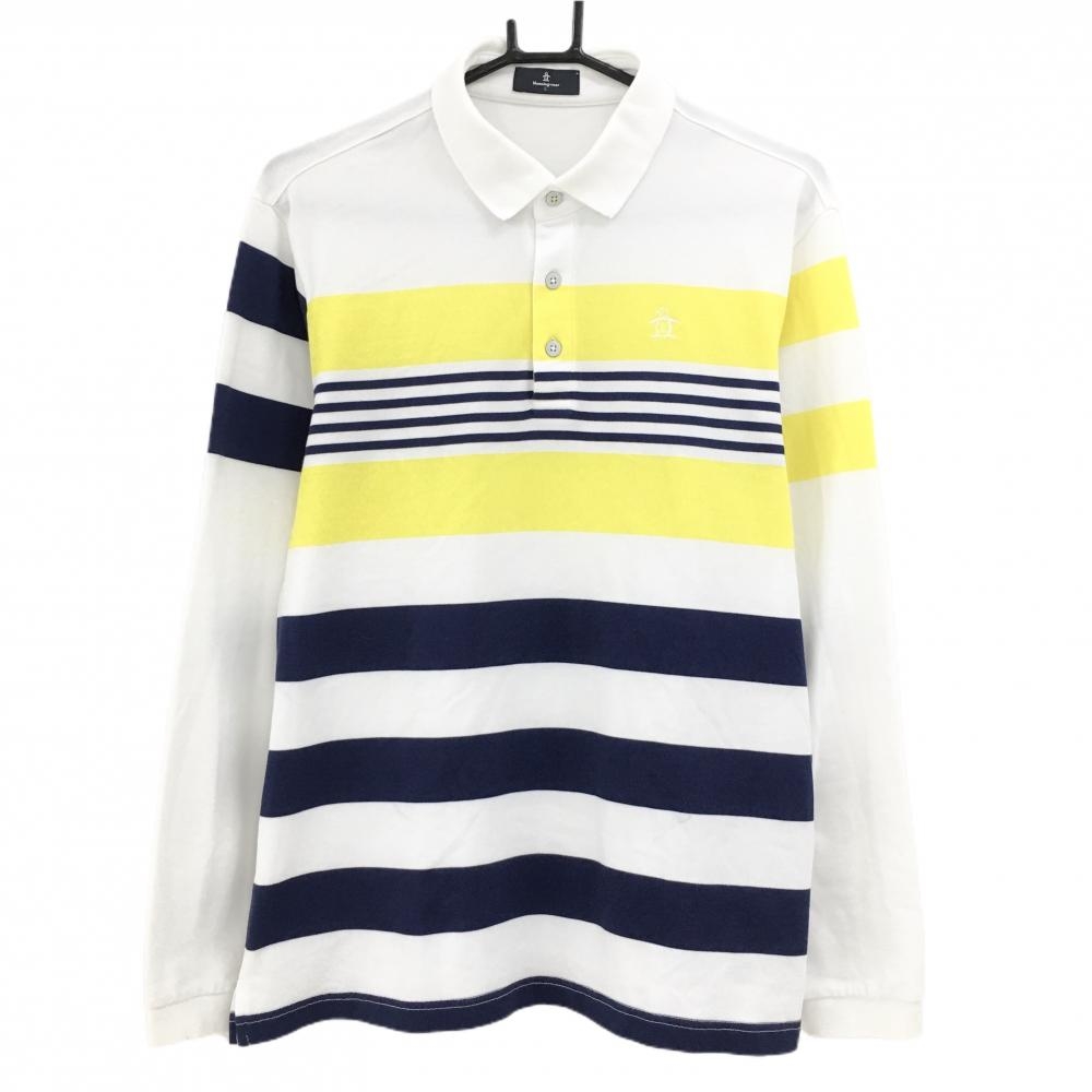 【超美品】マンシングウェア 長袖ポロシャツ ライトブルー×白 ボーダー ロゴ刺しゅう メンズ L ゴルフウェア Munsingwear