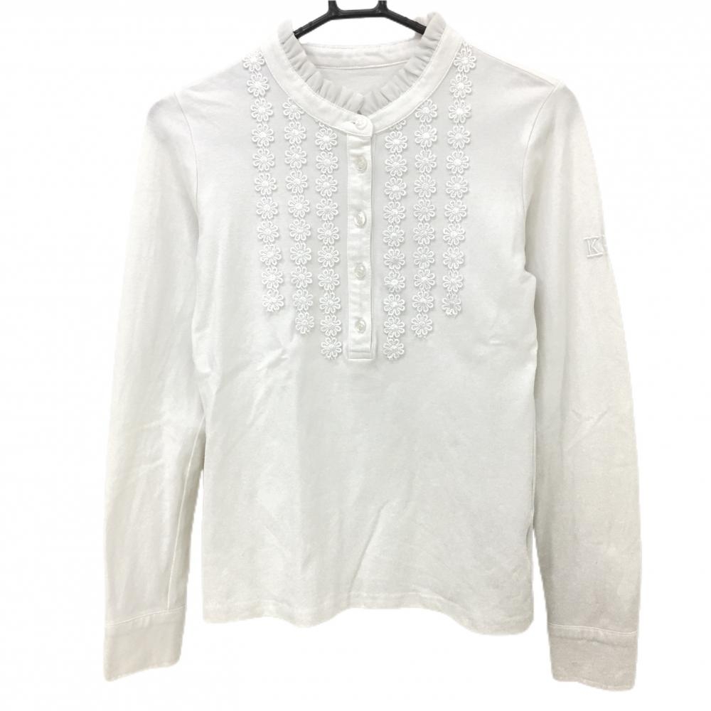 【美品】ジュンアンドロペ 長袖ポロシャツ 白 刺しゅうワッペン 襟裏ストライプ レディース L ゴルフウェア JUN&ROPE