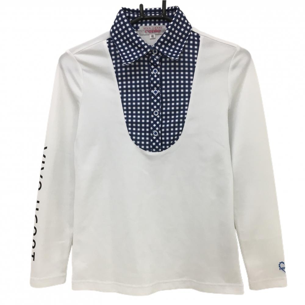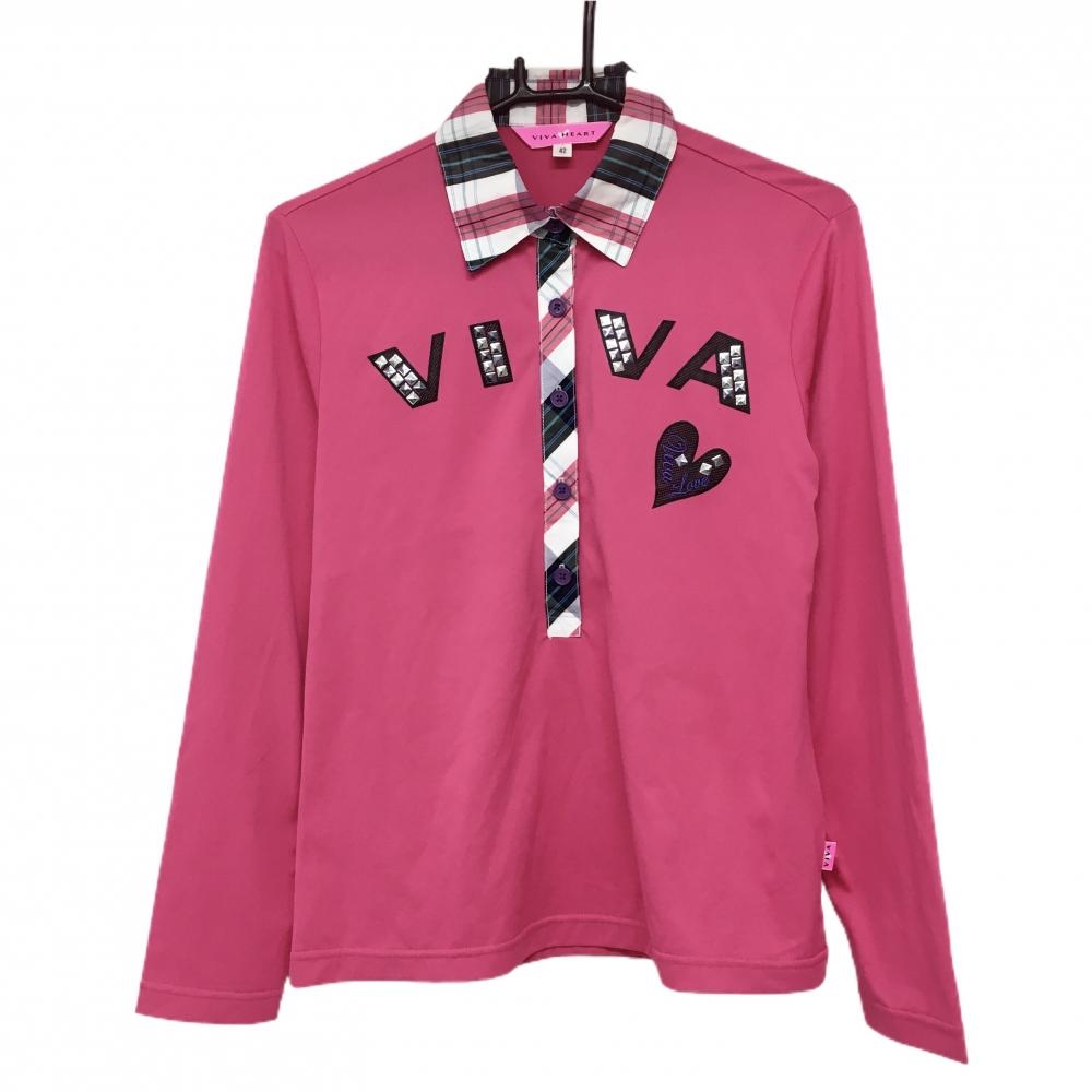 【超美品】ビバハートreplie 長袖ポロシャツ ネイビー×ピンク 襟裏チェック ロゴ 襟縁ライン レディース 40(M) ゴルフウェア VIVA HEART