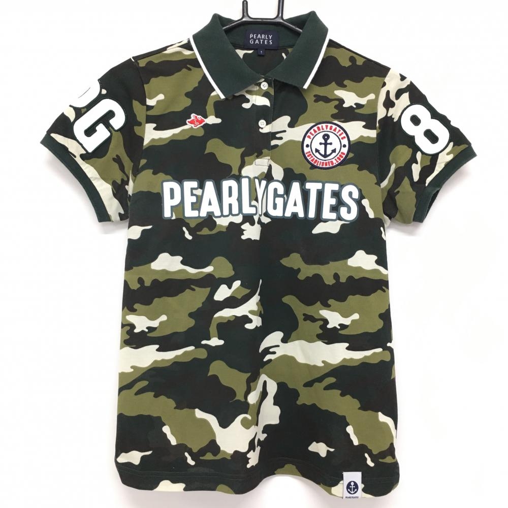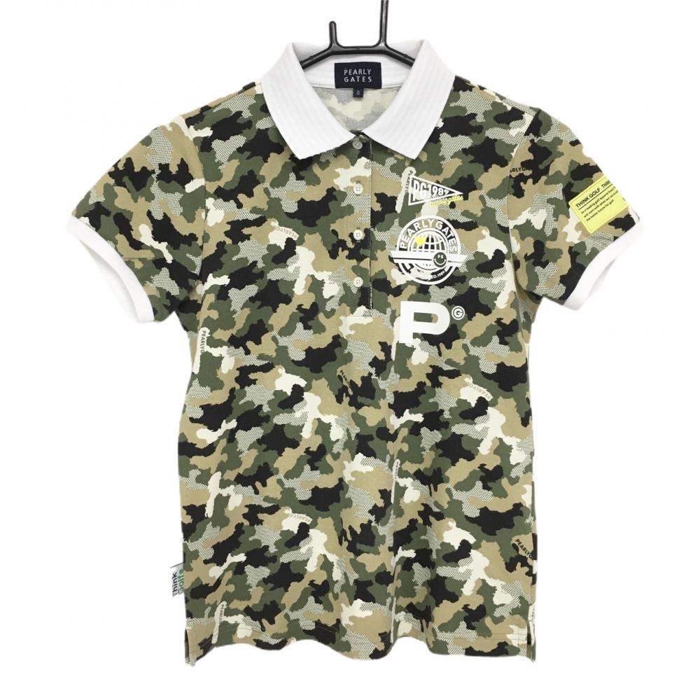【新品】パーリーゲイツ 半袖ポロシャツ カーキ×白 カモフラ ボーダー 迷彩 日本製 レディース 0(S) ゴルフウェア PEARLY GATES