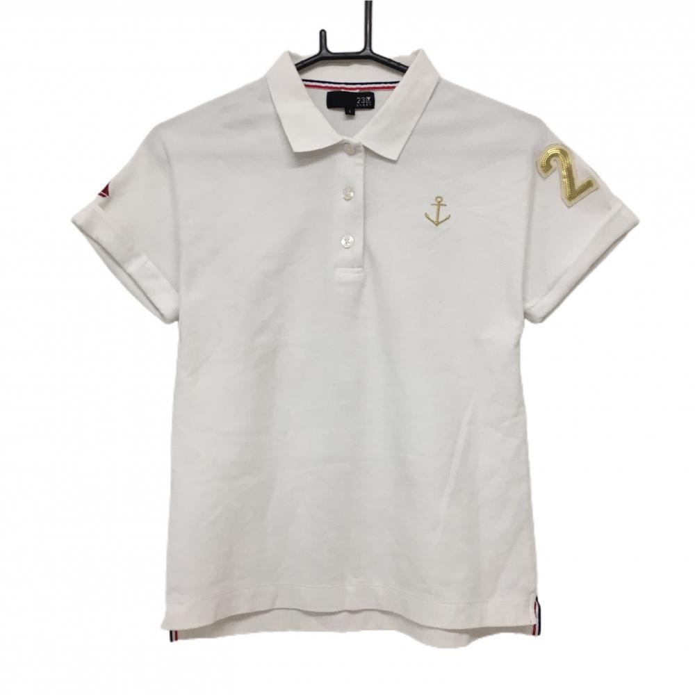 【美品】23区スポーツ 半袖ポロシャツ 白×ゴールド イカリ刺しゅう スパンコールロゴ レディース Ⅰ(M) ゴルフウェア 23区