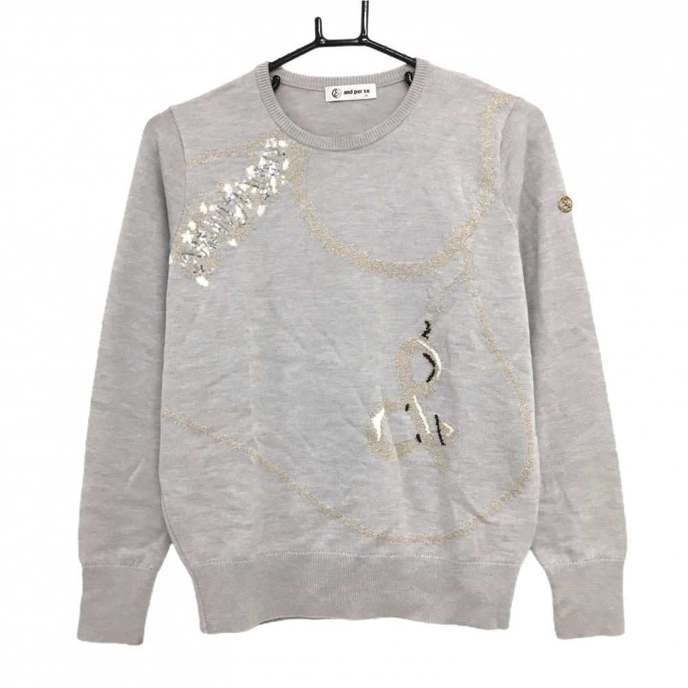 アンパスィ セーター ライトグレー×ゴールド 前身頃柄 スパンコール ウール混 ニット レディース M ゴルフウェア and per se