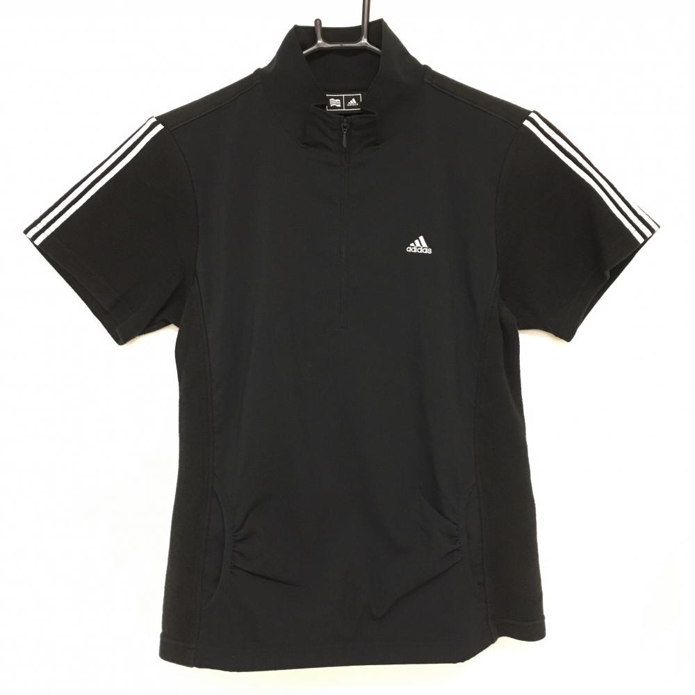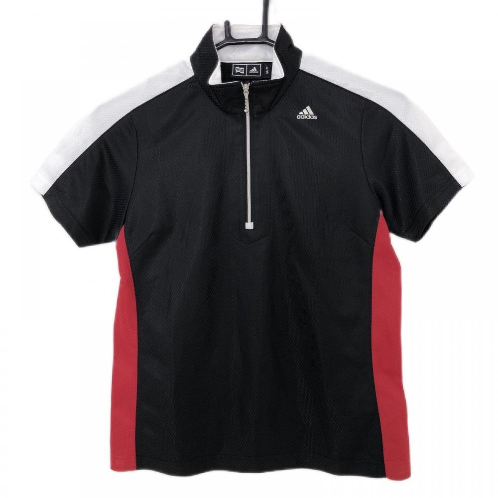 【美品】アディダス 半袖ハイネックシャツ 黒×白 サイドメッシュ調 ハーフジップ ロゴプリント レディース M/M ゴルフウェア adidas