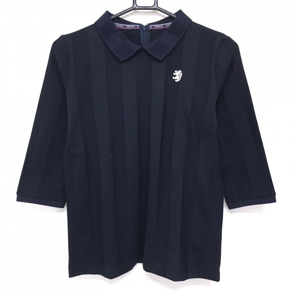 【美品】ルコック 半袖スキッパーシャツ ブルーネイビー×白 ビックプリント ロゴ刺しゅう レディース M ゴルフウェア le coq sportif