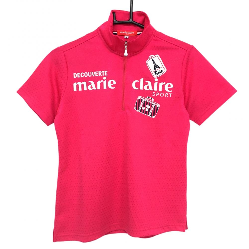【美品】マリクレール 半袖ハイネックシャツ レッド×白 ハーフジップ ロゴプリント レディース M ゴルフウェア marie claire