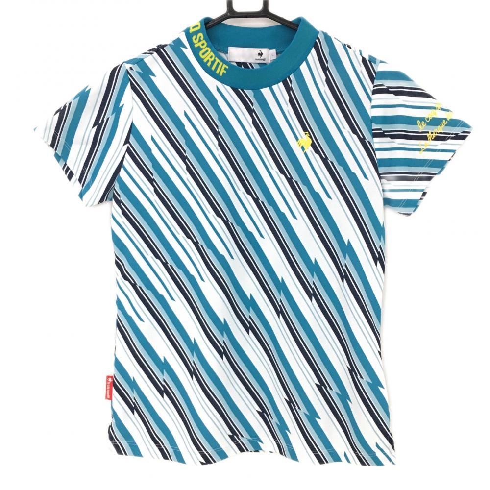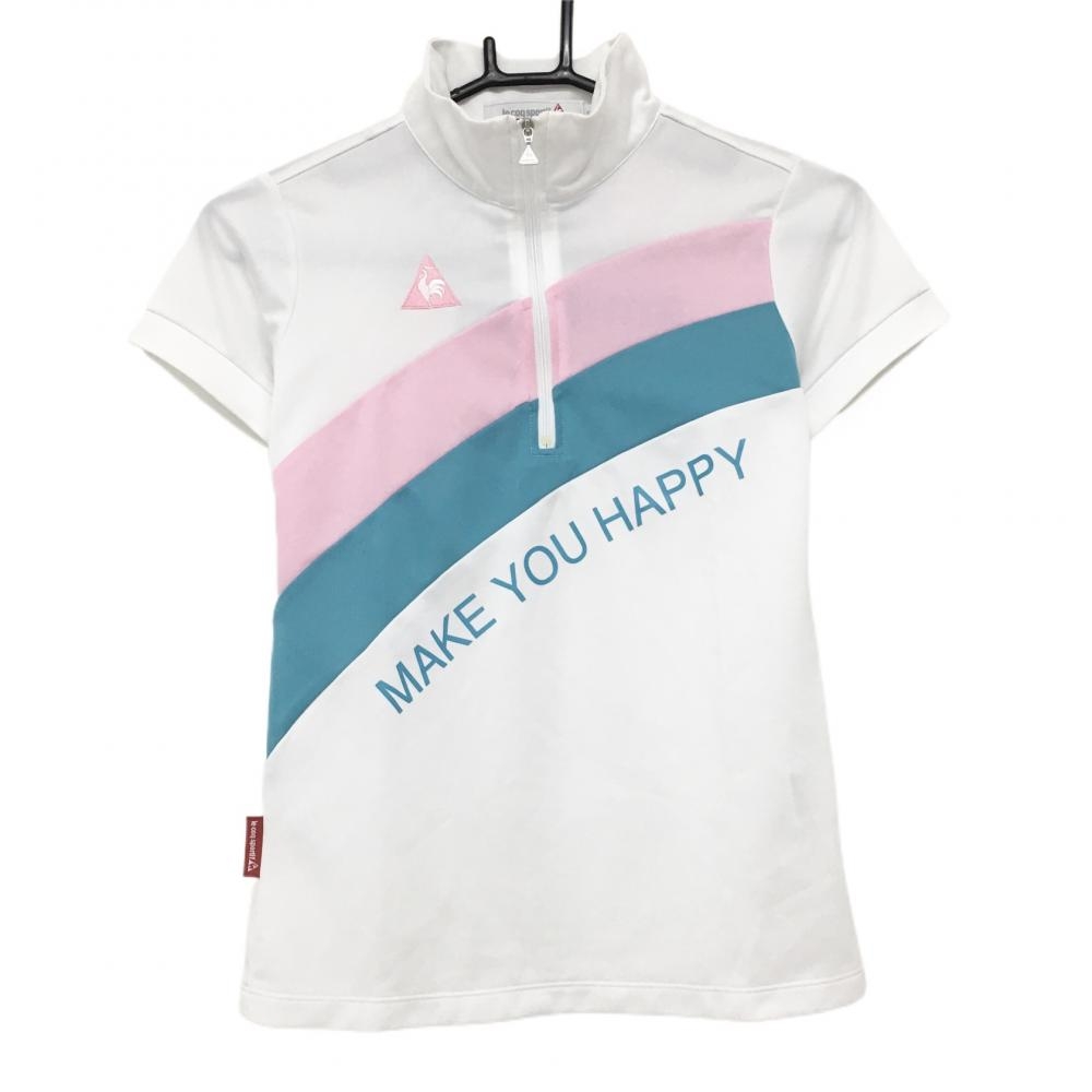 ルコック 半袖ハイネックシャツ 白×ブルー系 背面上部メッシュ ハーフジップ レディース M ゴルフウェア le coq sportif