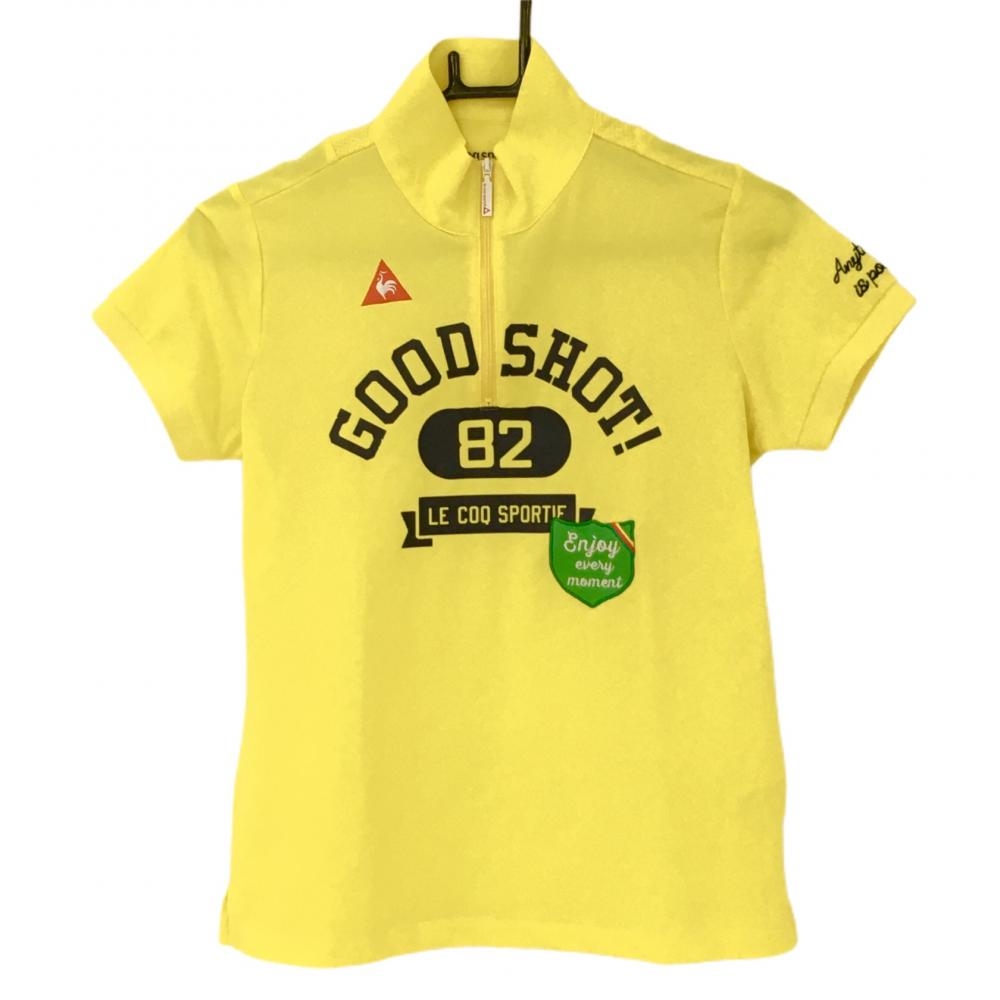 【美品】ルコック 半袖ハイネックシャツ イエロー×ネイビー ハーフジップ プリントロゴ レディース M ゴルフウェア le coq sportif