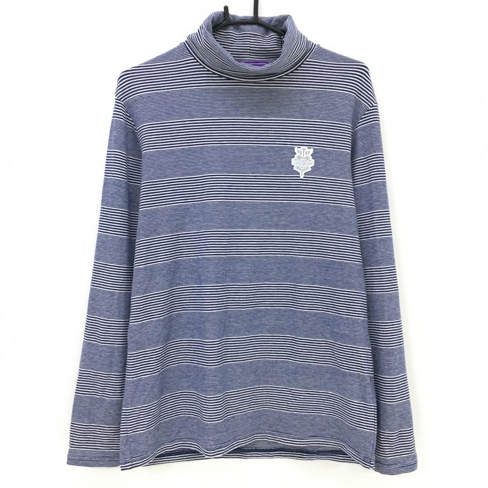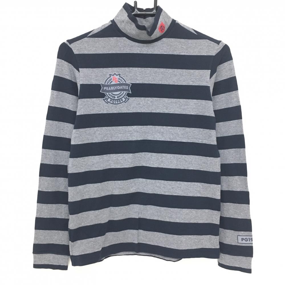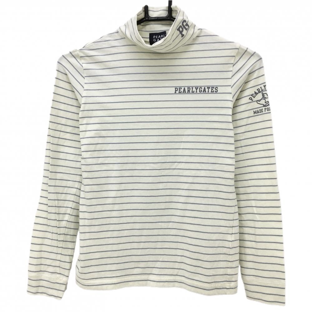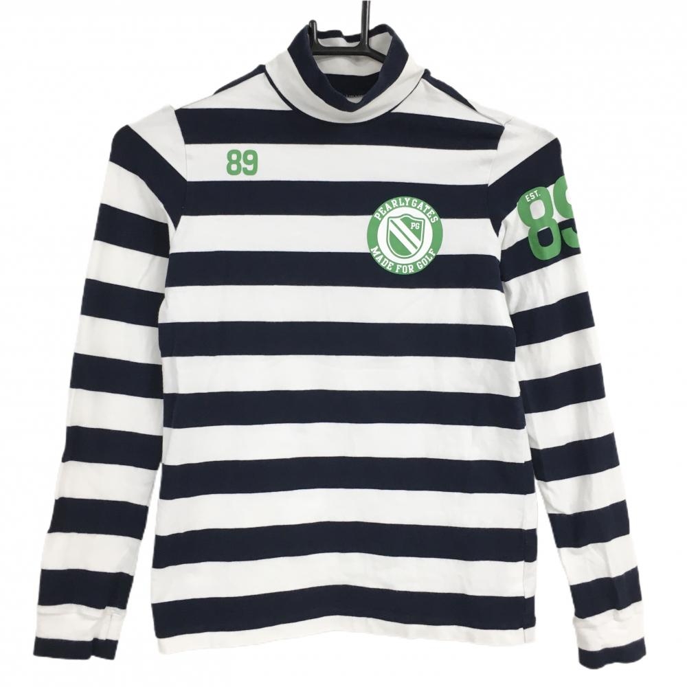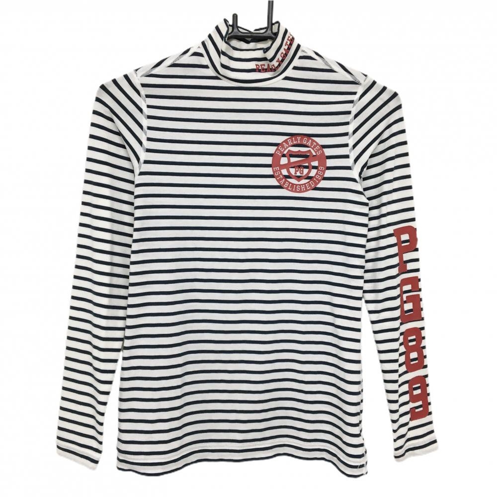 【美品】パーリーゲイツ 長袖ハイネックシャツ 白×ネイビー ボーダー ロゴプリント レディース 1(M) ゴルフウェア PEARLY GATES