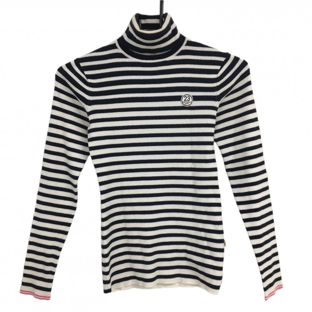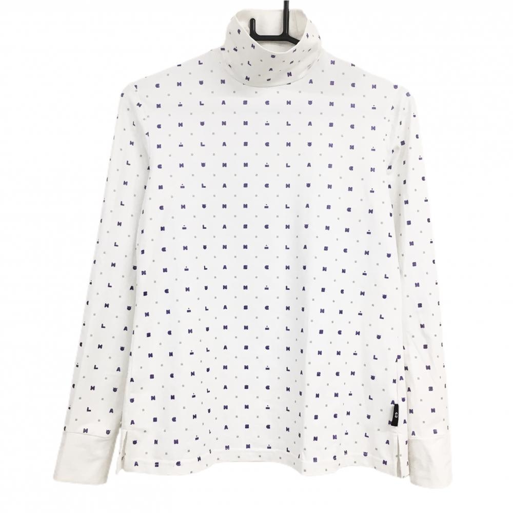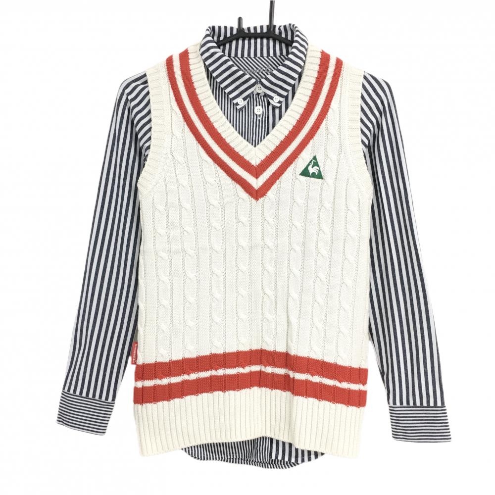 【美品】ルコックゴルフ 長袖ハイネックシャツ 白×ネイビー フロントロゴ レディース M ゴルフウェア le coq sportif