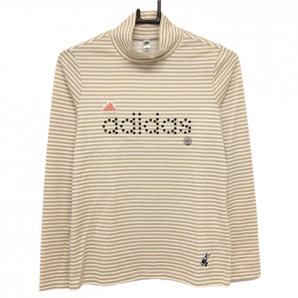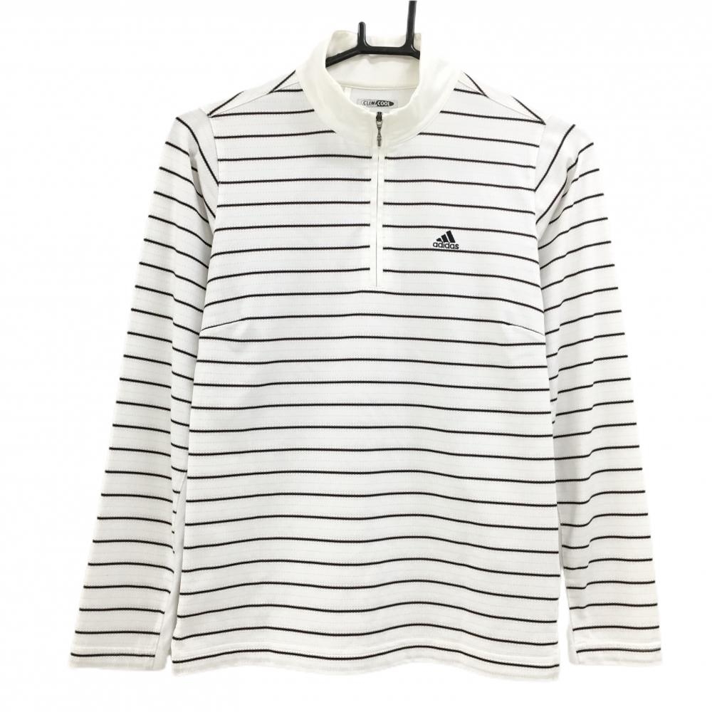 【超美品】アディダス 長袖ハイネックシャツ 白 ボーダー地模様 ロゴ刺しゅう ハーフジップ レディース S/P ゴルフウェア adidas