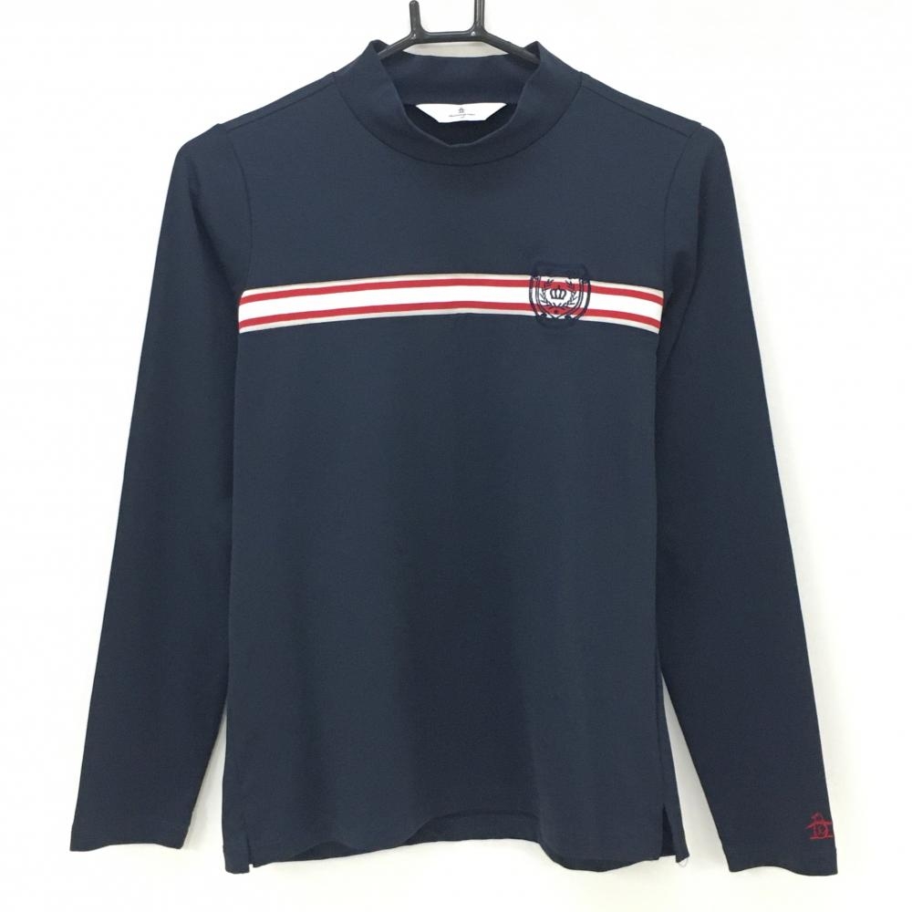 【美品】マンシングウェア 長袖ハイネックシャツ ネイビー×イエロー 袖口ライン エンボスロゴ レディース L ゴルフウェア Munsingwear