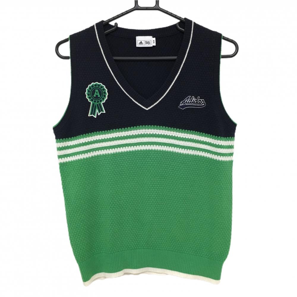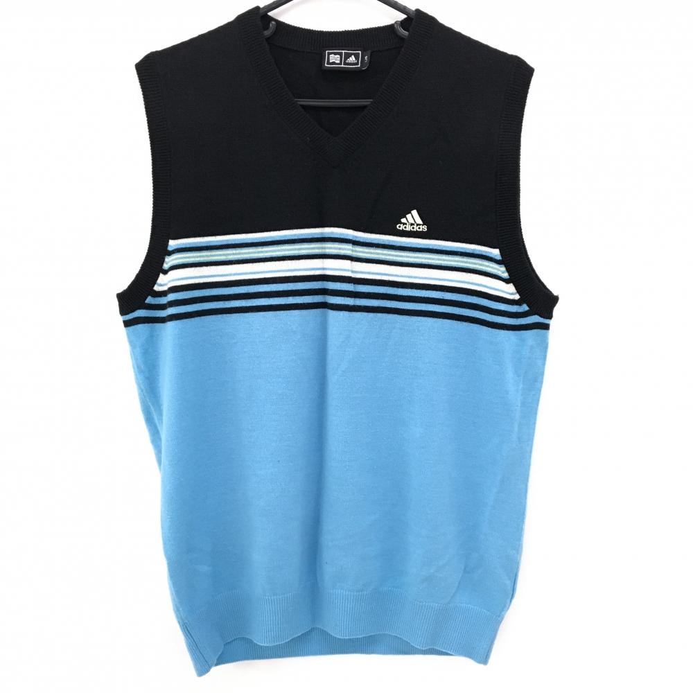 【美品】アディダス ニットベスト ライトブルー×ネイビー ケーブル編み 背面ストライプ Vネック レディース M/M ゴルフウェア adidas