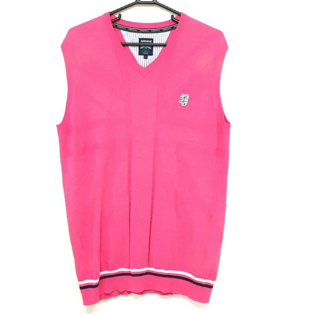 【超美品】アディダス ニットベスト ネイビー×ピンク ケーブル編み Vネック ウール混 レディース S/P ゴルフウェア adidas